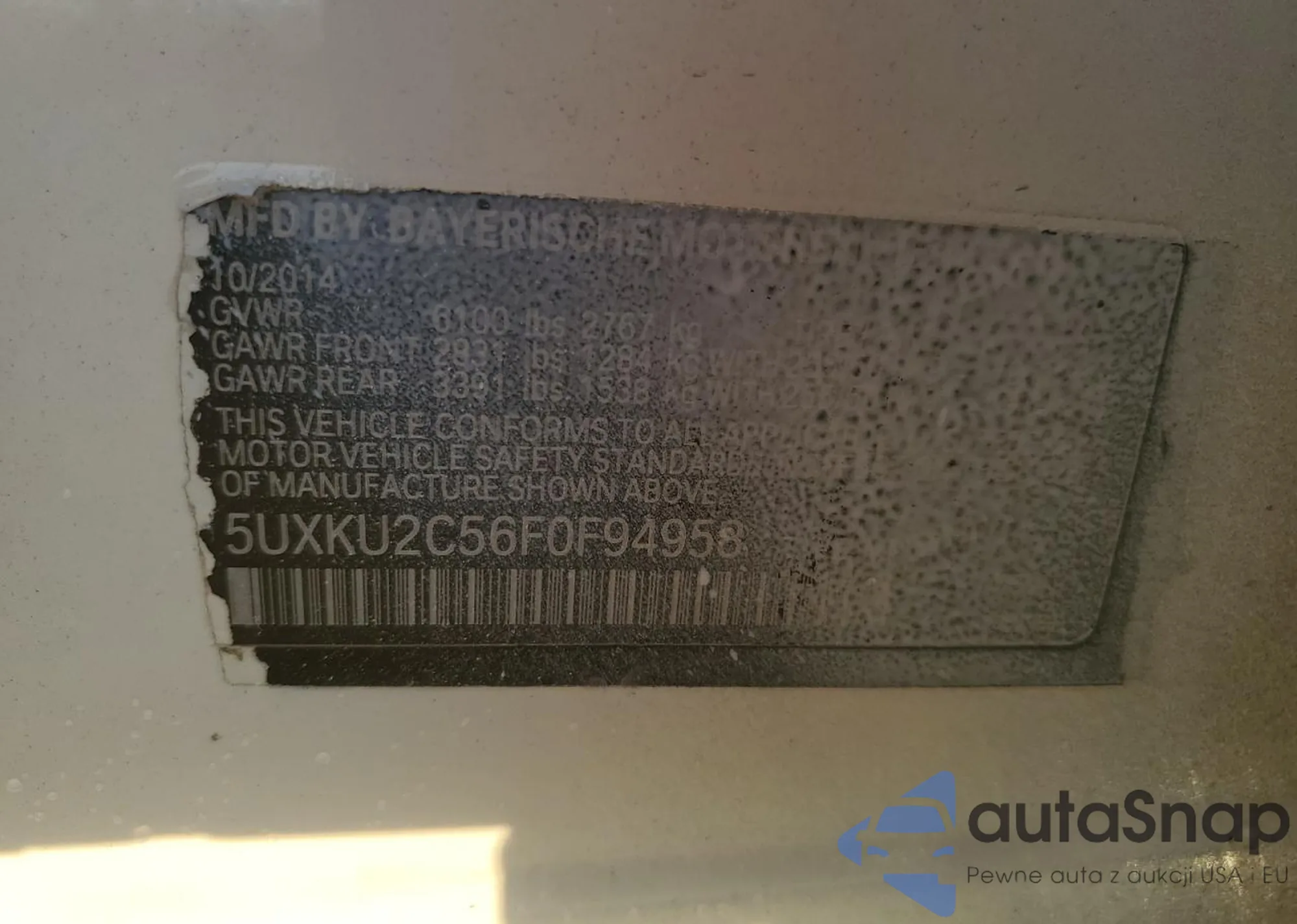 The car BMW X6 2015 (VIN 5UXKU2C56F0F94958) has documents that prevent registration. Export and registration may be difficult. Contact AutaSnap experts to find alternatives.