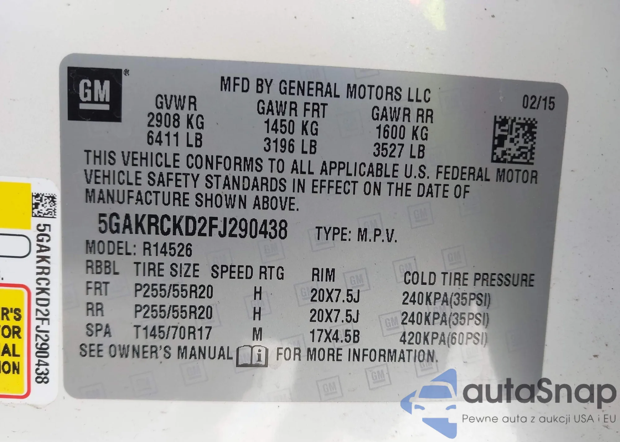 The car Buick Enclave 2015 (VIN 5GAKRCKD2FJ290438) has not been auctioned before. The documents are clean, and the mileage matches or is below the market average. Sold by an insurance company – we recommend purchase. Delivery to the port will take approx. 6–8 weeks.