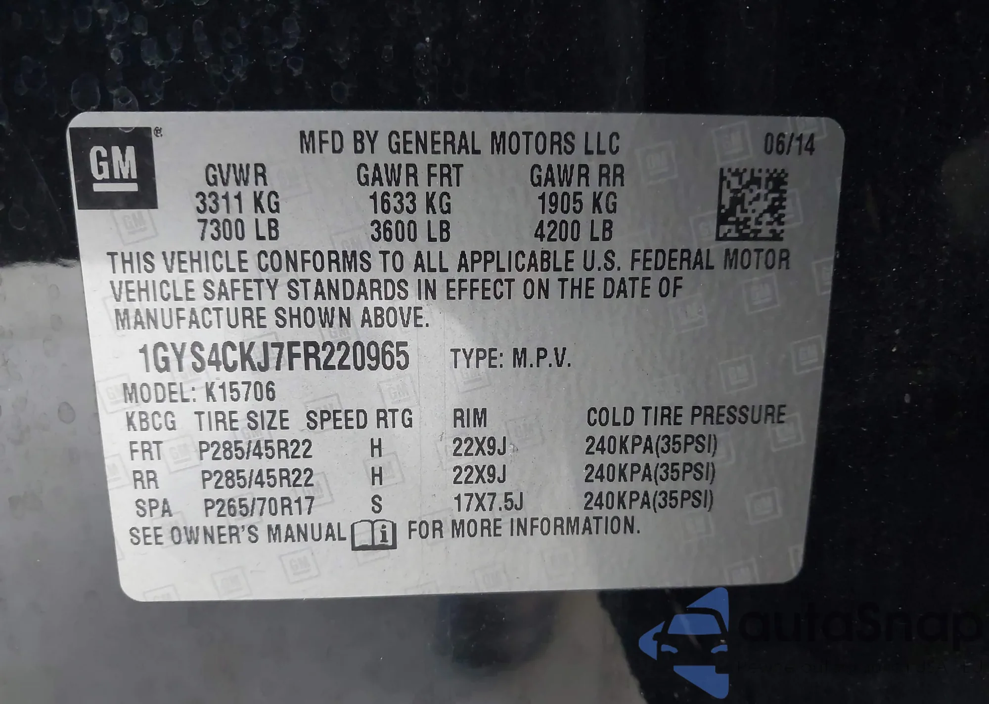 VIN: 1GYS4CKJ7FR220965