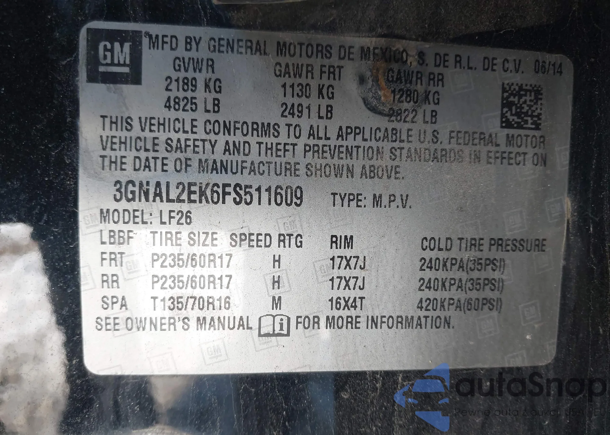 VIN: 3GNAL2EK6FS511609
