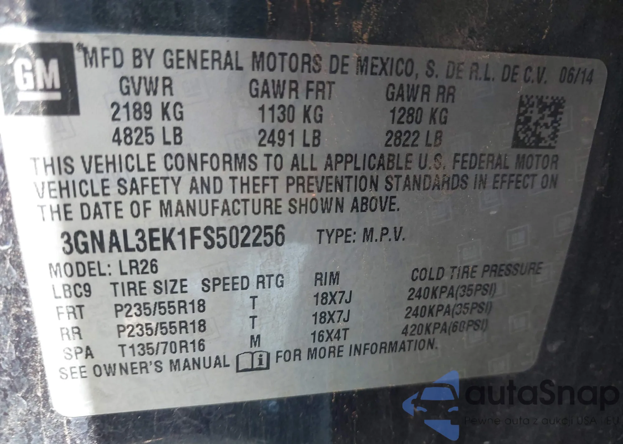 • VIN: 3GNAL3EK1FS502256