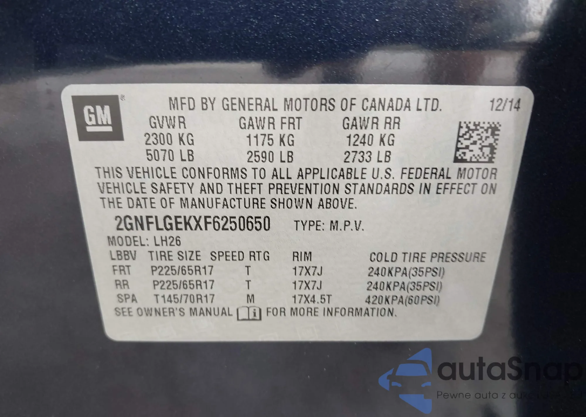 VIN: 2GNFLGEKXF6250650