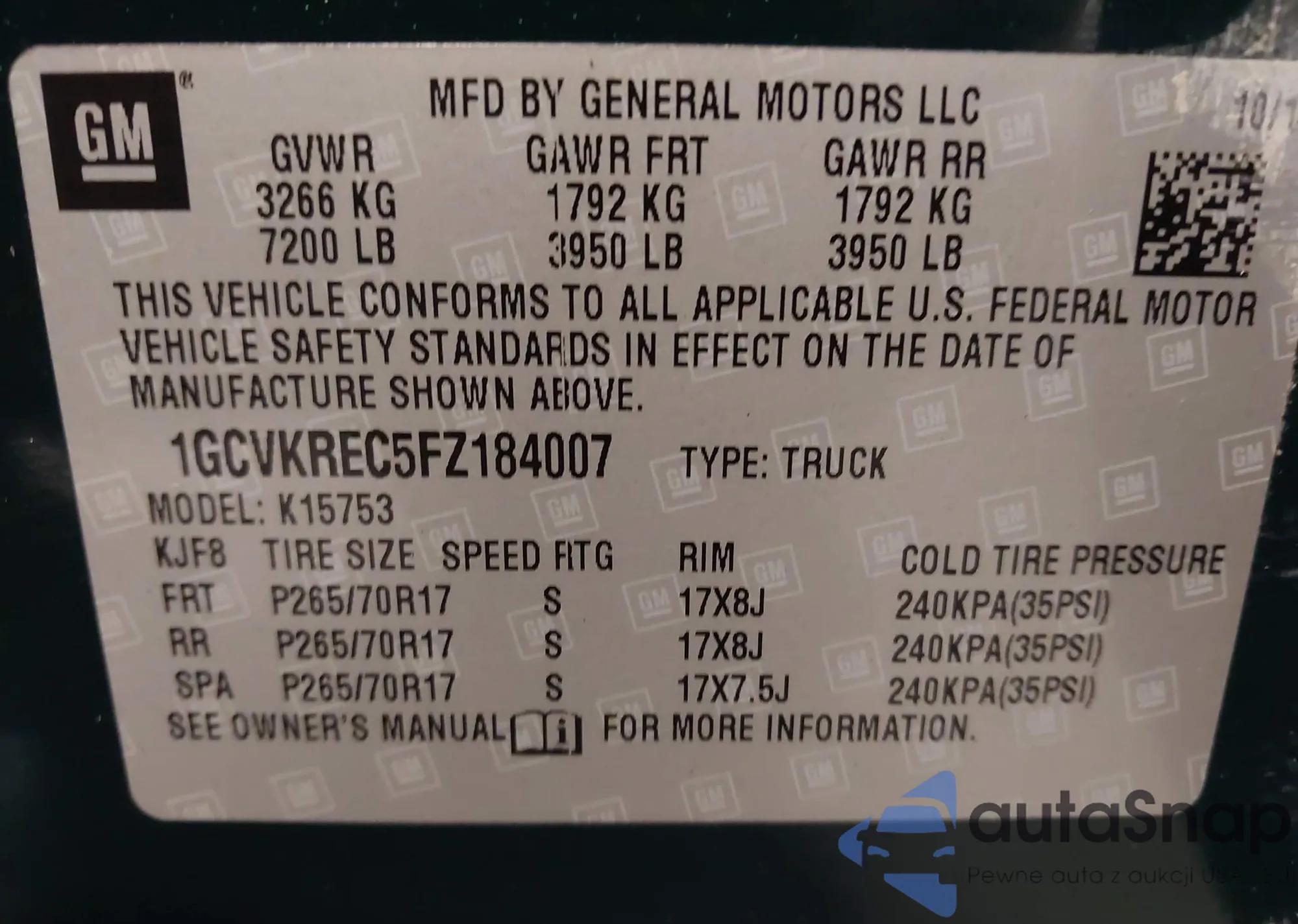 • VIN: 1GCVKREC5FZ184007