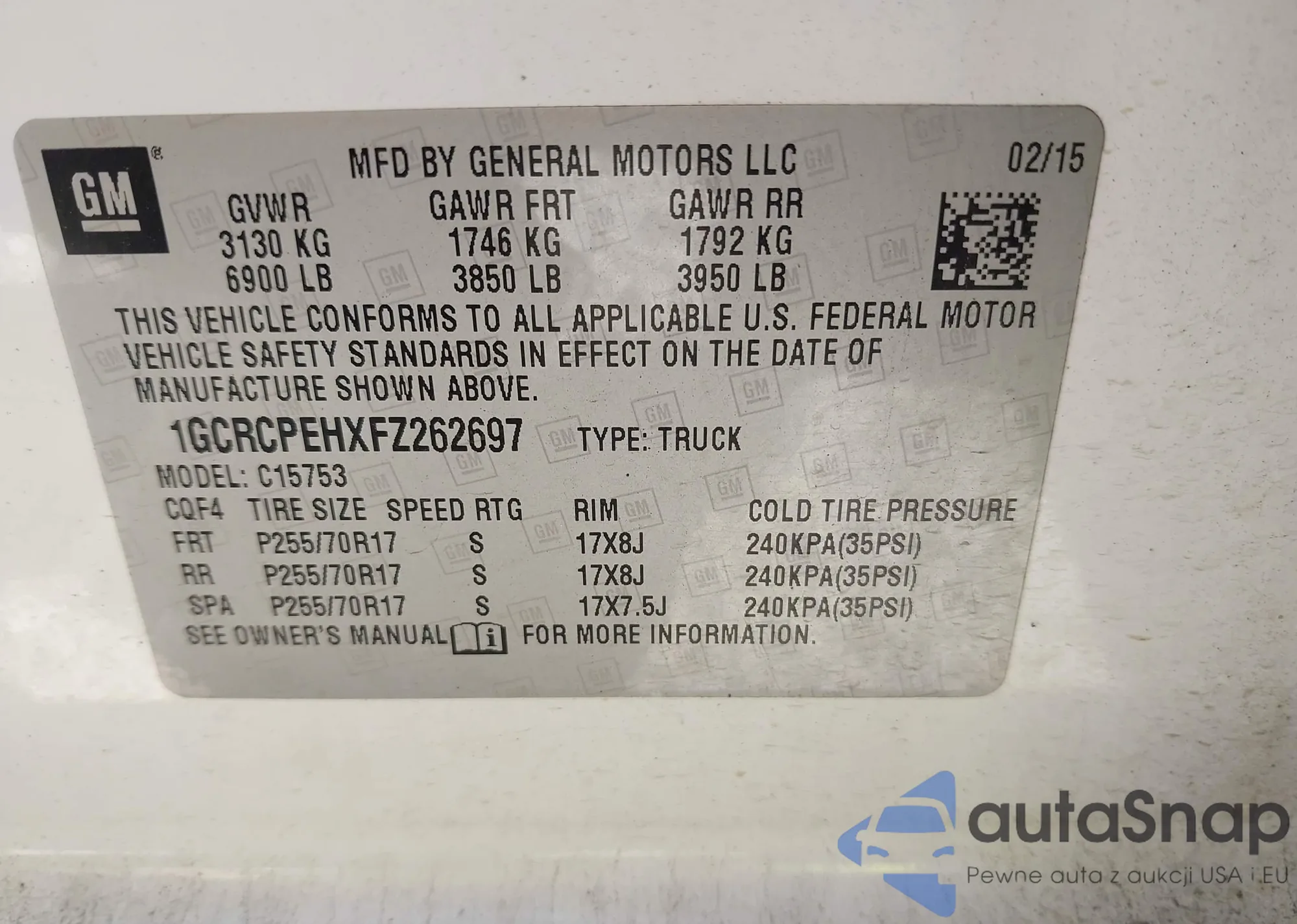 The car Chevrolet Silverado 2015 (VIN 1GCRCPEHXFZ262697) has not been auctioned before. The documents are clean, and the mileage matches or is below the market average. Sold by an insurance company – we recommend purchase. Delivery to the port will take approx. 6–8 weeks.