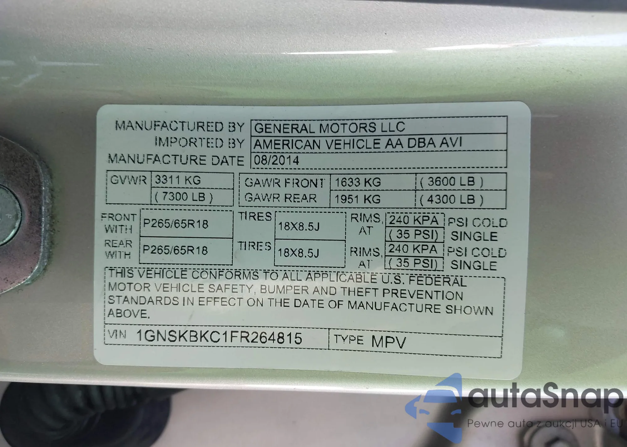VIN: 1GNSKBKC1FR264815