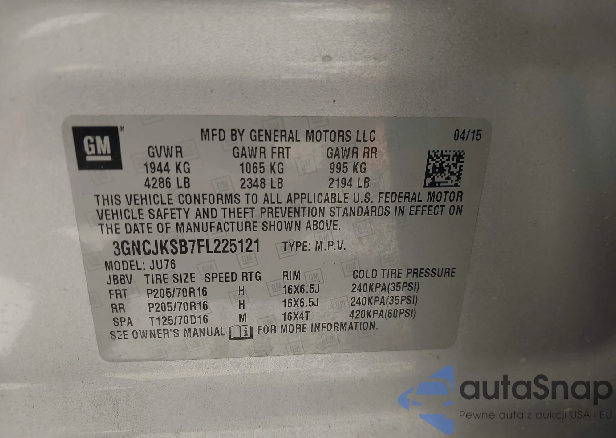 VIN: 3GNCJKSB7FL225121
