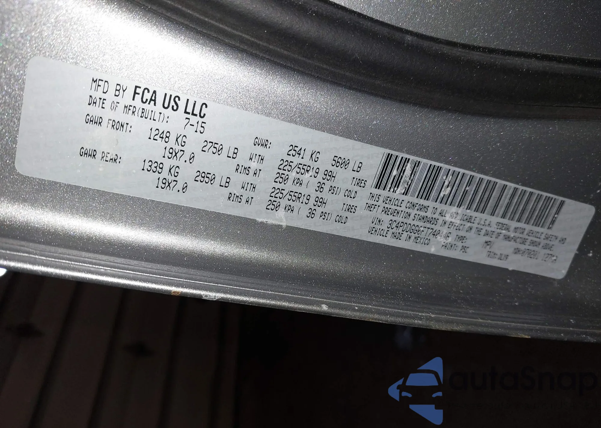 The car Dodge Journey 2015 (VIN 3C4PDDGG0FT740446) has not been auctioned before. The documents are clean, and the mileage matches or is below the market average. Sold by an insurance company – we recommend purchase. Delivery to the port will take approx. 6–8 weeks.