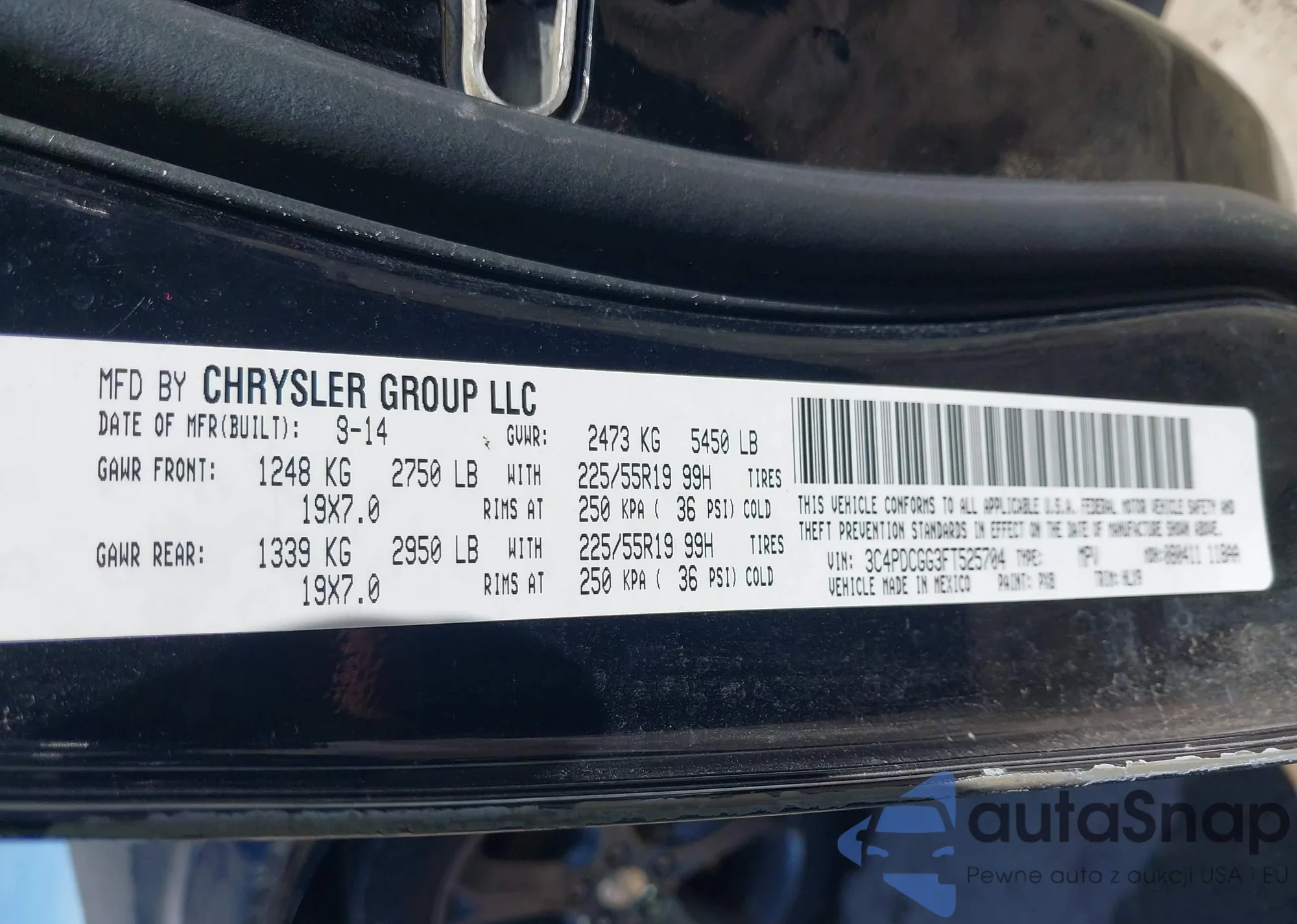 The car Dodge Journey 2015 (VIN 3C4PDCGG3FT525704) has not been auctioned before. The documents are clean, and the mileage matches or is below the market average. Sold by an insurance company – we recommend purchase. Delivery to the port will take approx. 6–8 weeks.