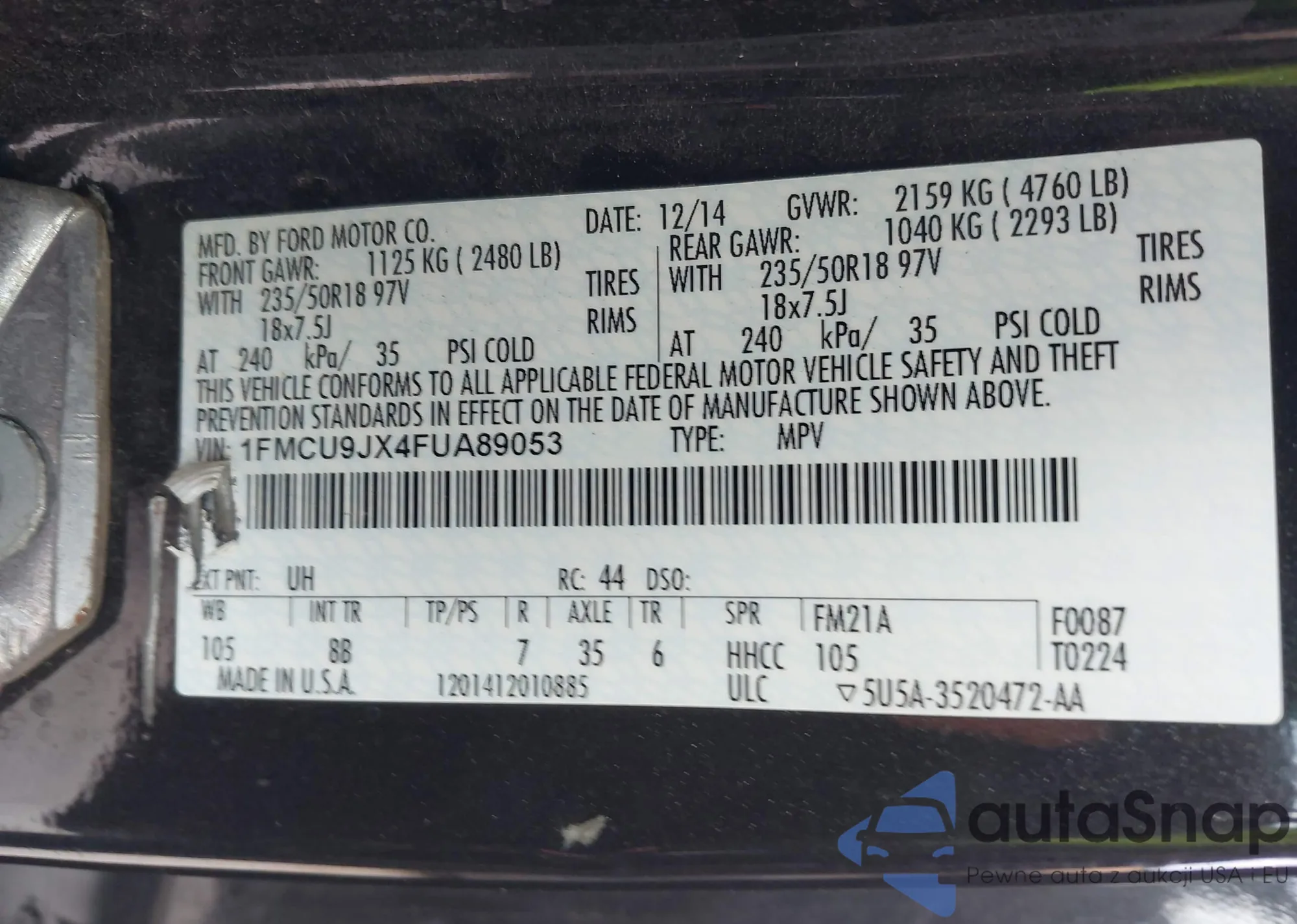 • VIN: 1FMCU9JX4FUA89053