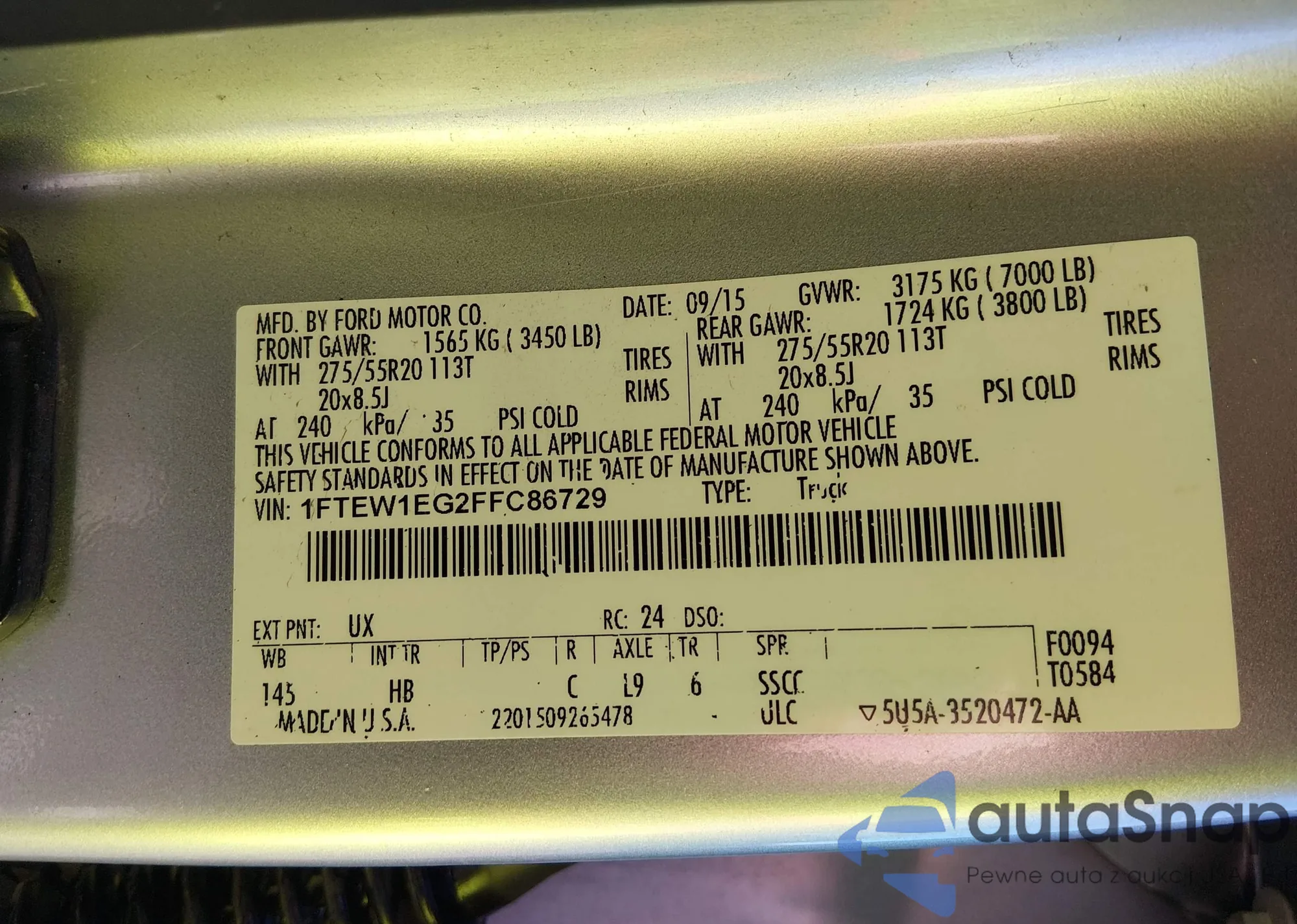 The car Ford F-150 2015 (VIN 1FTEW1EG2FFC86729) has not been auctioned before. The documents are clean, and the mileage matches or is below the market average. Sold by an insurance company – we recommend purchase. Delivery to the port will take approx. 6–8 weeks.