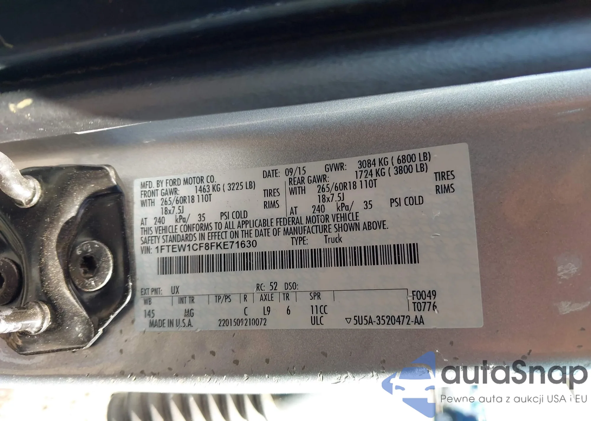 The car Ford F-150 2015 (VIN 1FTEW1CF8FKE71630) has not been auctioned before. The documents are clean, and the mileage matches or is below the market average. Sold by an insurance company – we recommend purchase. Delivery to the port will take approx. 6–8 weeks.
