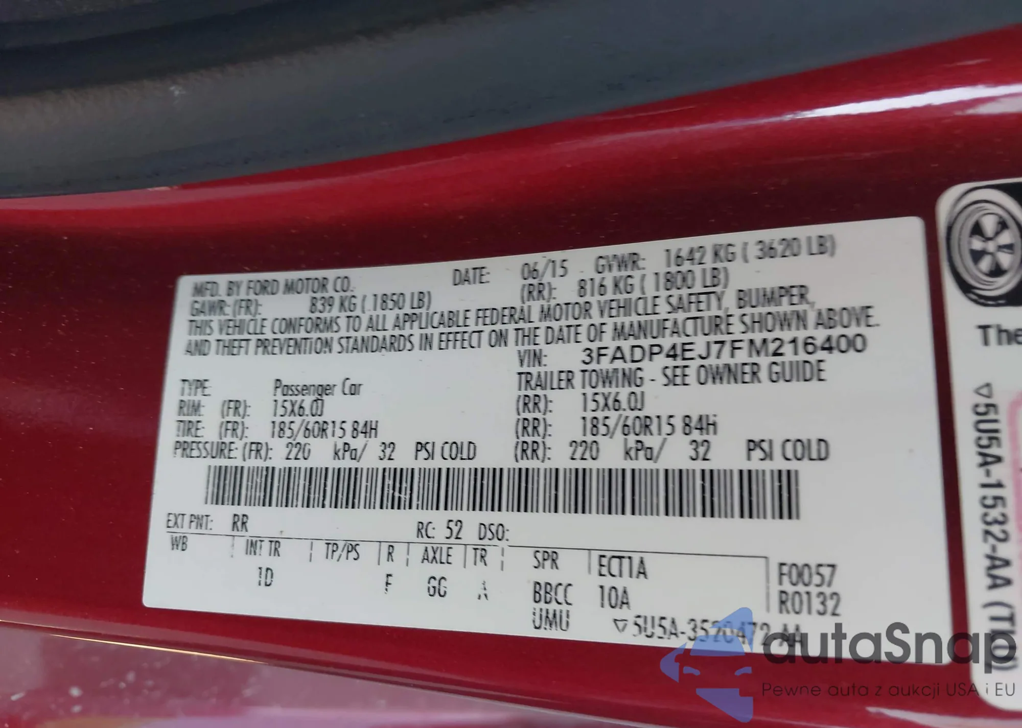 The car Ford Fiesta 2015 (VIN 3FADP4EJ7FM216400) has not been auctioned before. The documents are clean, and the mileage matches or is below the market average. Sold by an insurance company – we recommend purchase. Delivery to the port will take approx. 6–8 weeks.