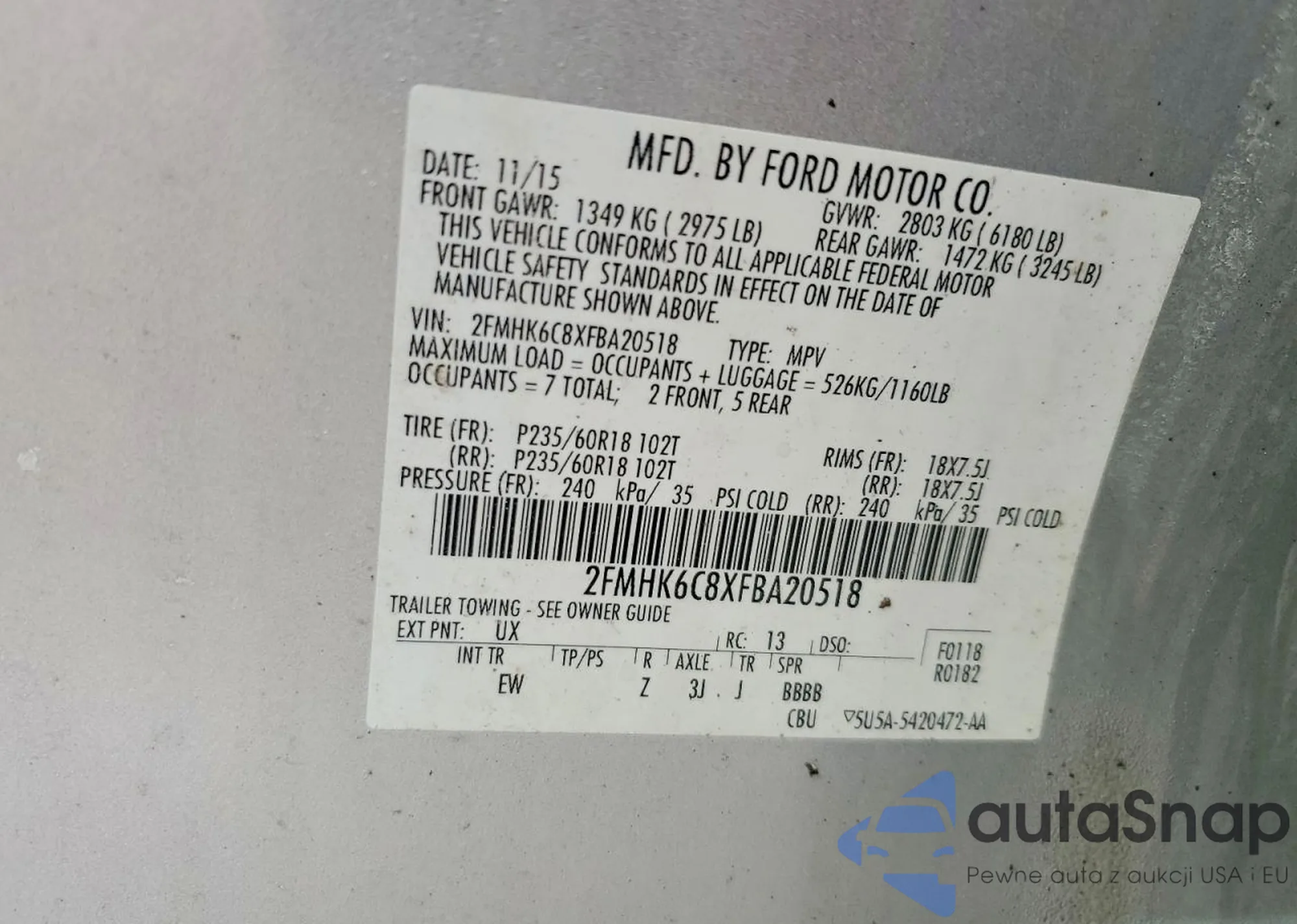 The car Ford Flex 2015 (VIN 2FMHK6C8XFBA20518) has not been auctioned before. The documents are clean, and the mileage matches or is below the market average. Sold by an insurance company – we recommend purchase. Delivery to the port will take approx. 6–8 weeks.