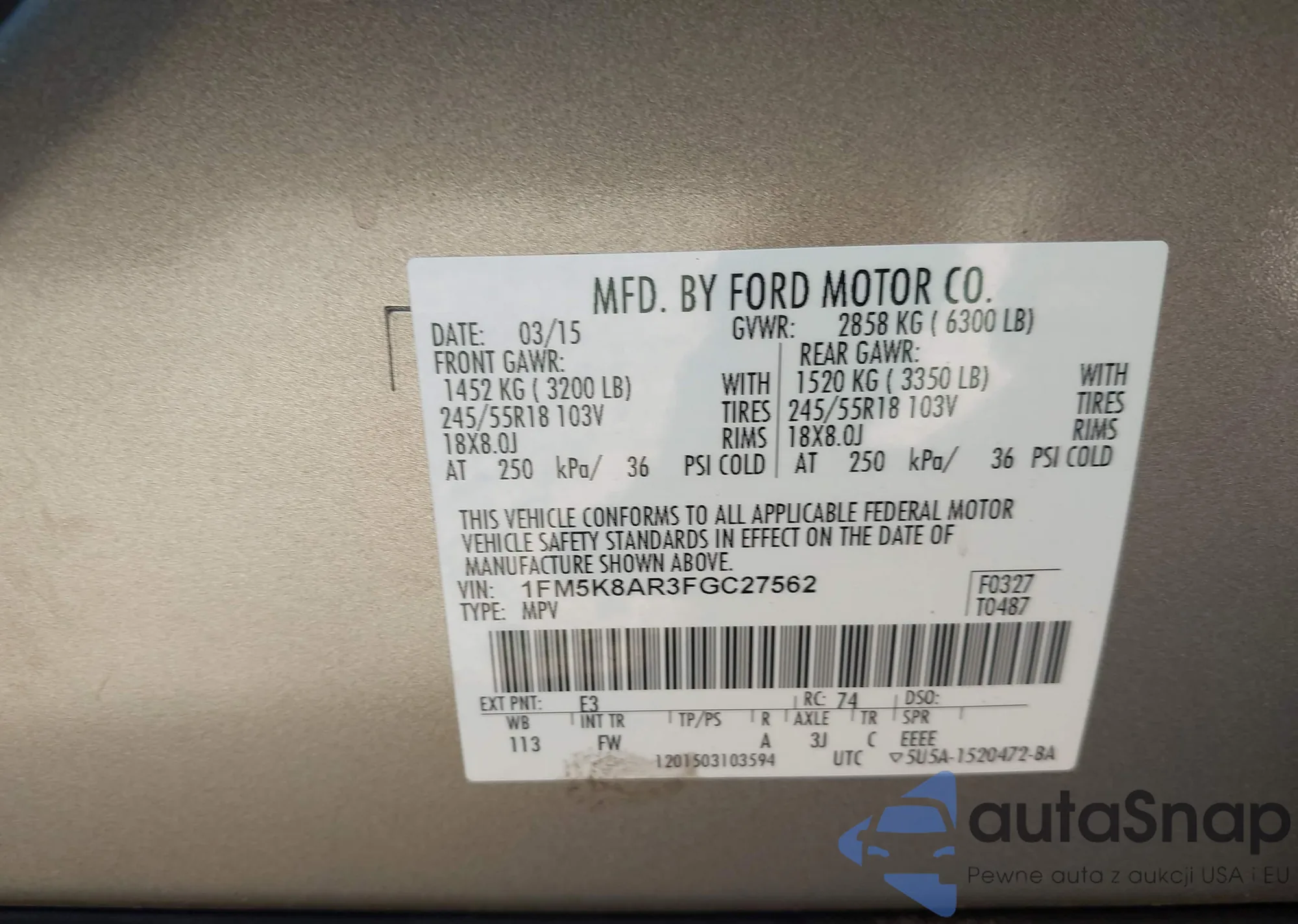 VIN: 1FM5K8AR3FGC27562