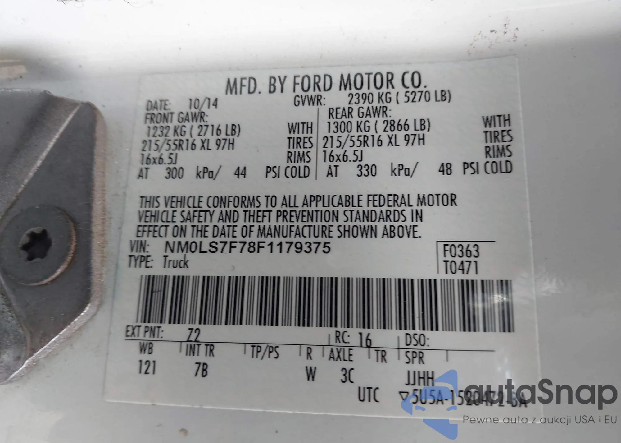 The car Ford Transit 2015 (VIN NM0LS7F78F1179375) has not been auctioned before. The documents are clean, and the mileage matches or is below the market average. Sold by an insurance company – we recommend purchase. Delivery to the port will take approx. 6–8 weeks.