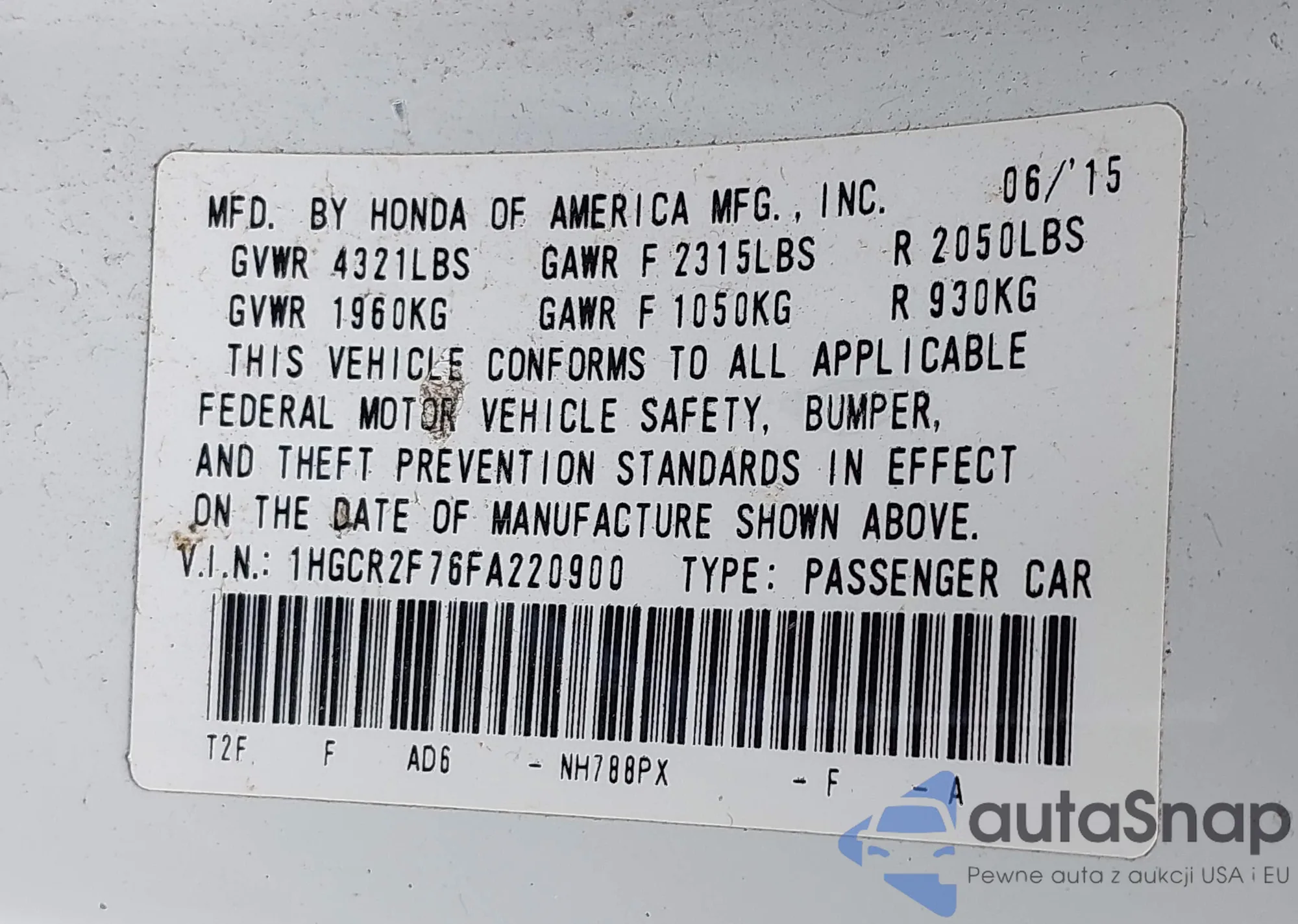 VIN: 1HGCR2F76FA220900