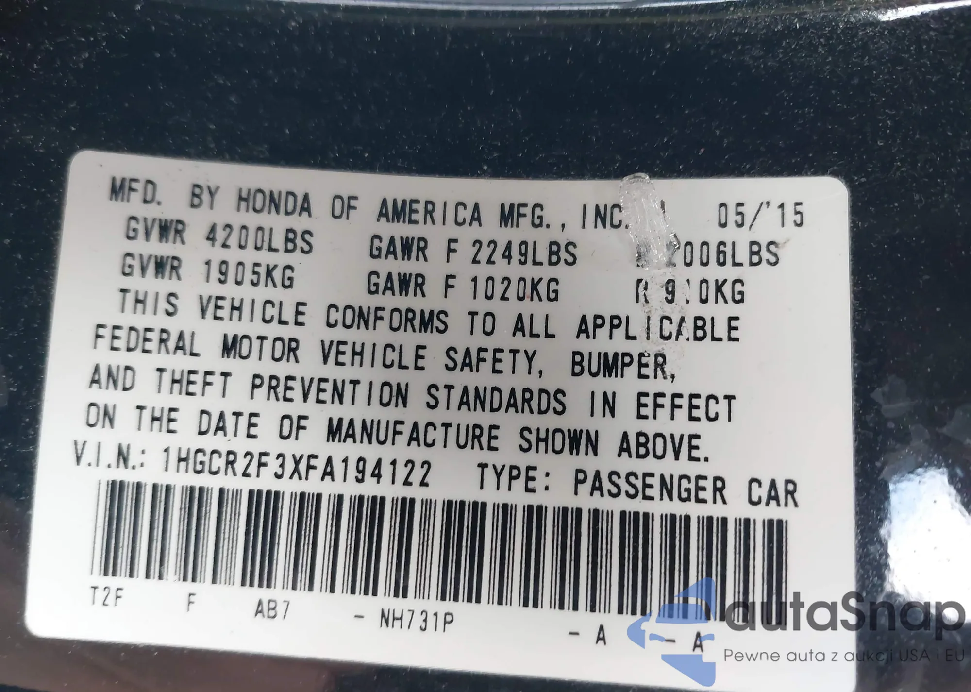 VIN: 1HGCR2F3XFA194122