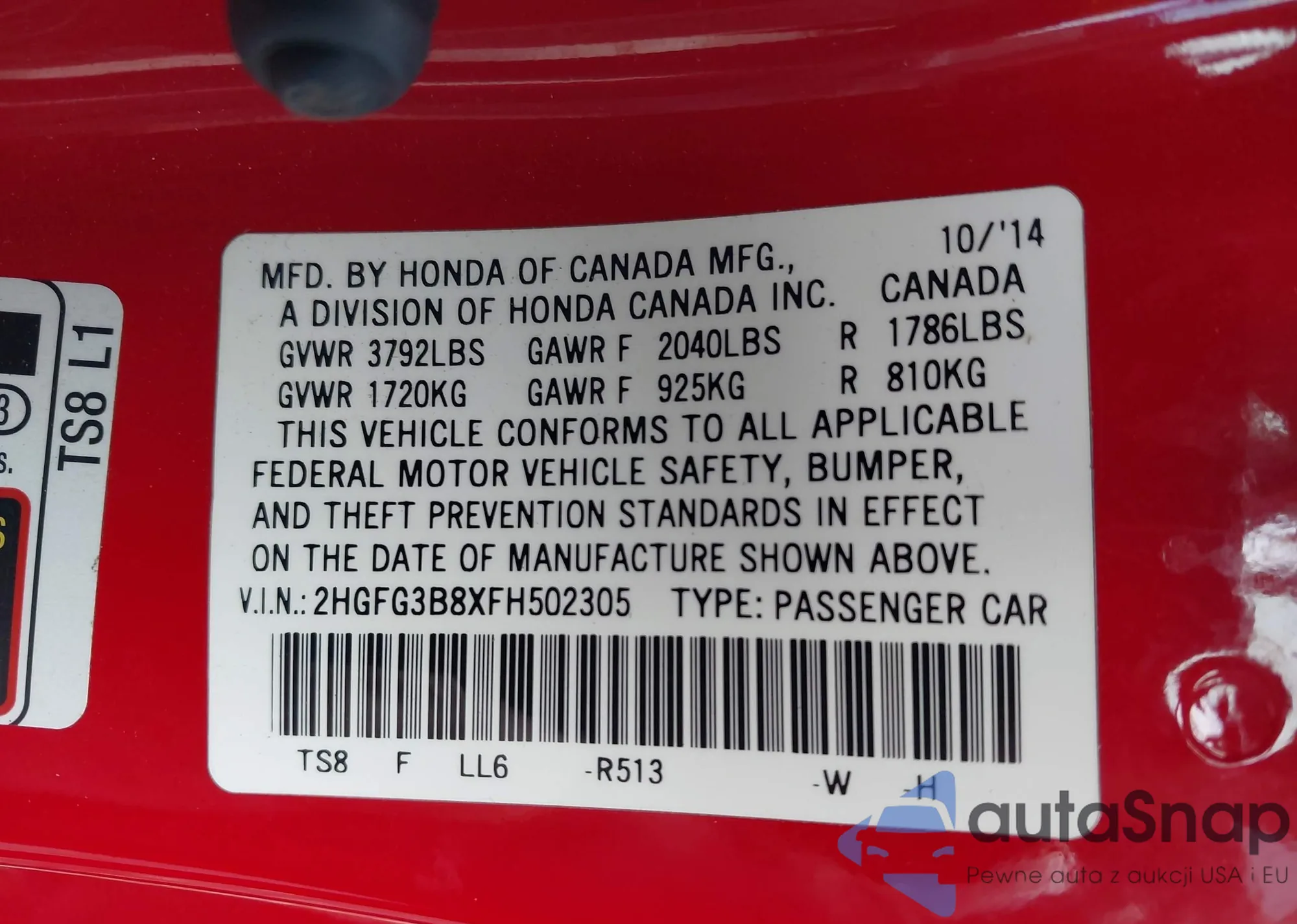 The car Honda Civic 2015 (VIN 2HGFG3B8XFH502305) has not been auctioned before. The documents are clean, and the mileage matches or is below the market average. Sold by an insurance company – we recommend purchase. Delivery to the port will take approx. 6–8 weeks.