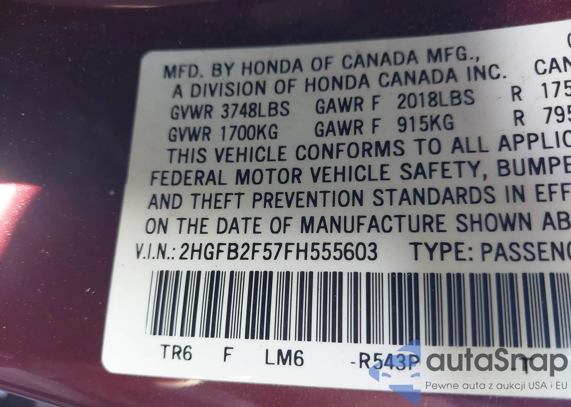 • VIN: 2HGFB2F57FH555603