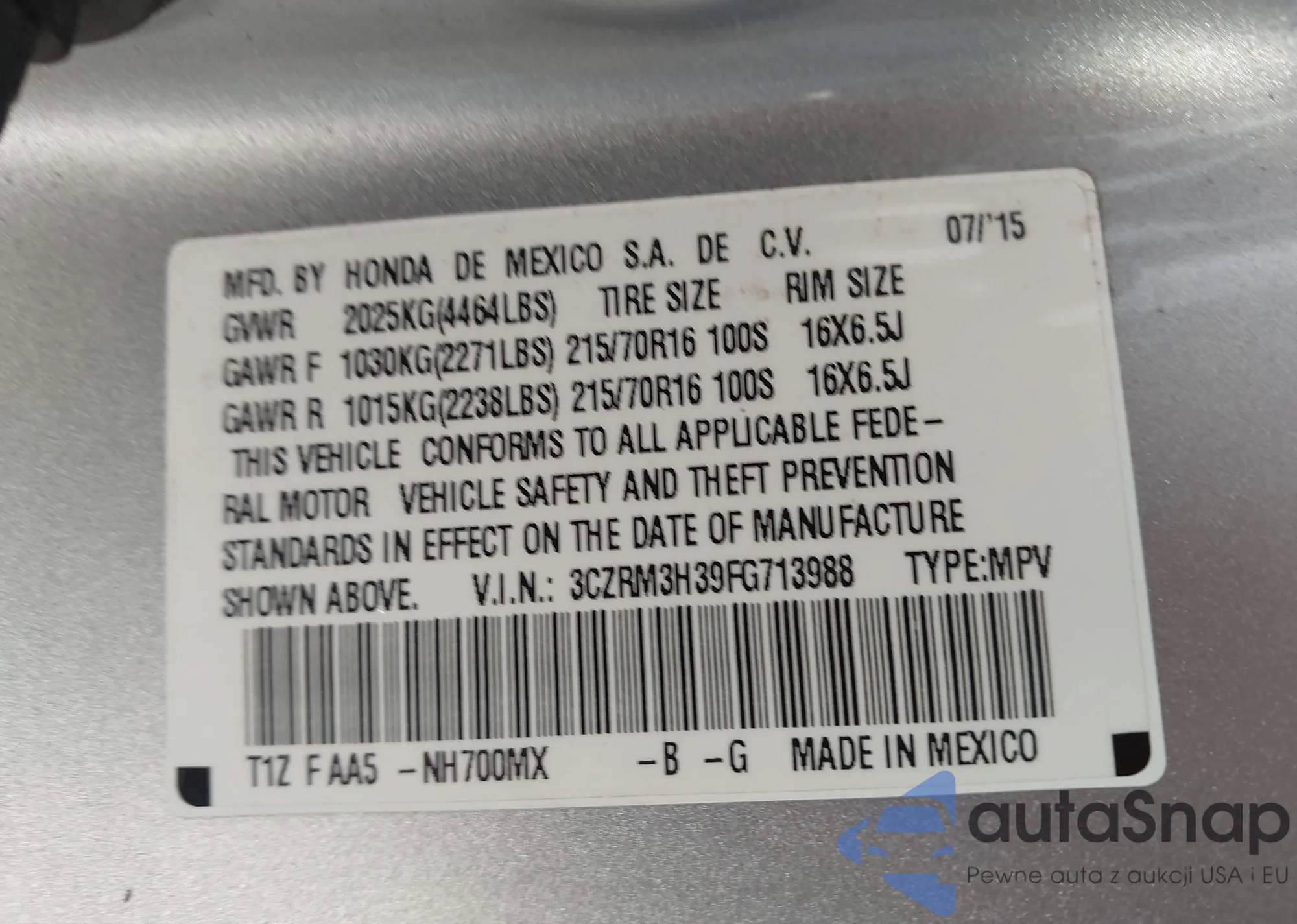 The car Honda CR-V 2015 (VIN 3CZRM3H39FG713988) has not been auctioned before. The documents are clean, and the mileage matches or is below the market average. Sold by an insurance company – we recommend purchase. Delivery to the port will take approx. 6–8 weeks.