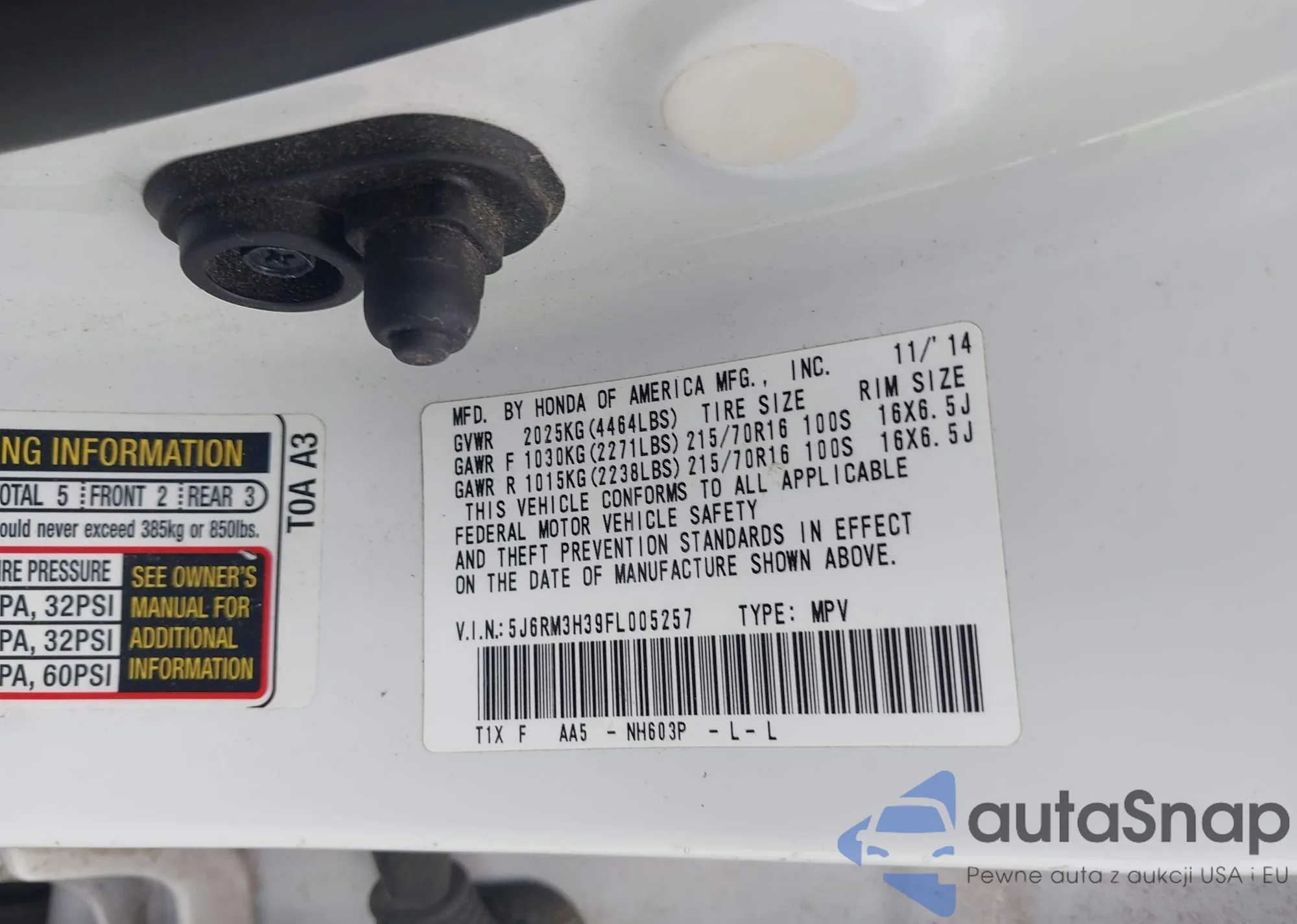 VIN: 5J6RM3H39FL005257