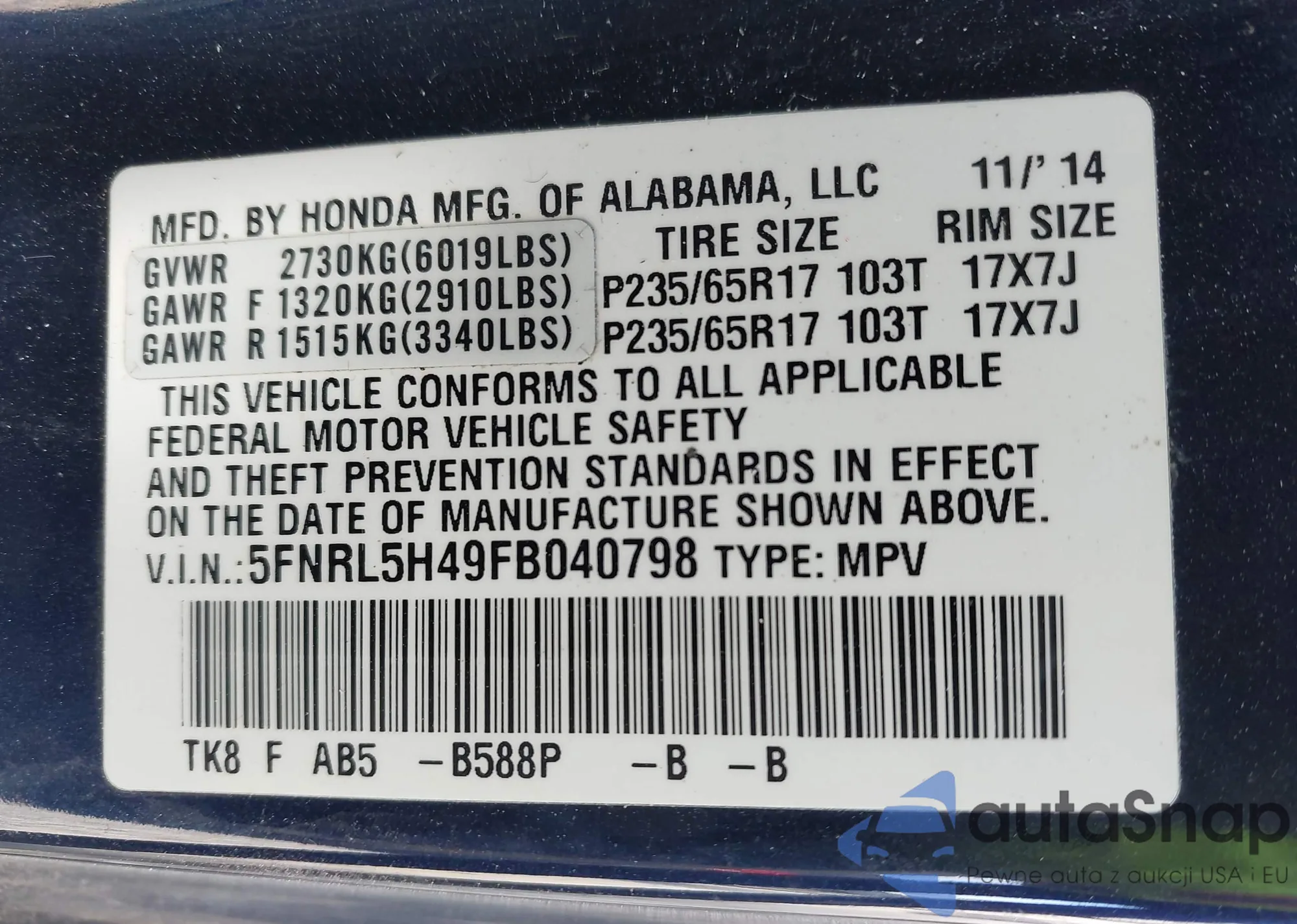 The car Honda Odyssey 2015 (VIN 5FNRL5H49FB040798) has not been auctioned before. The documents are clean, and the mileage matches or is below the market average. Sold by an insurance company – we recommend purchase. Delivery to the port will take approx. 6–8 weeks.