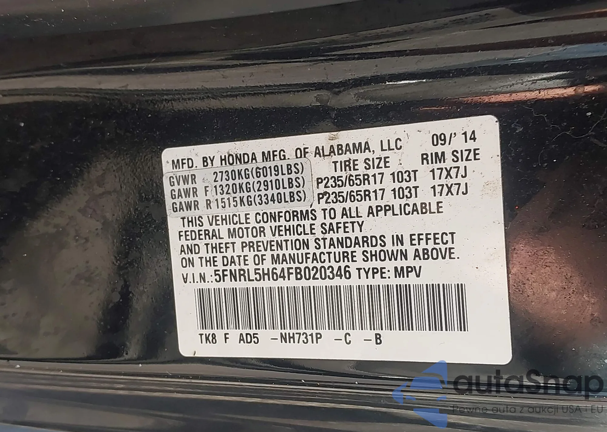 VIN: 5FNRL5H64FB020346