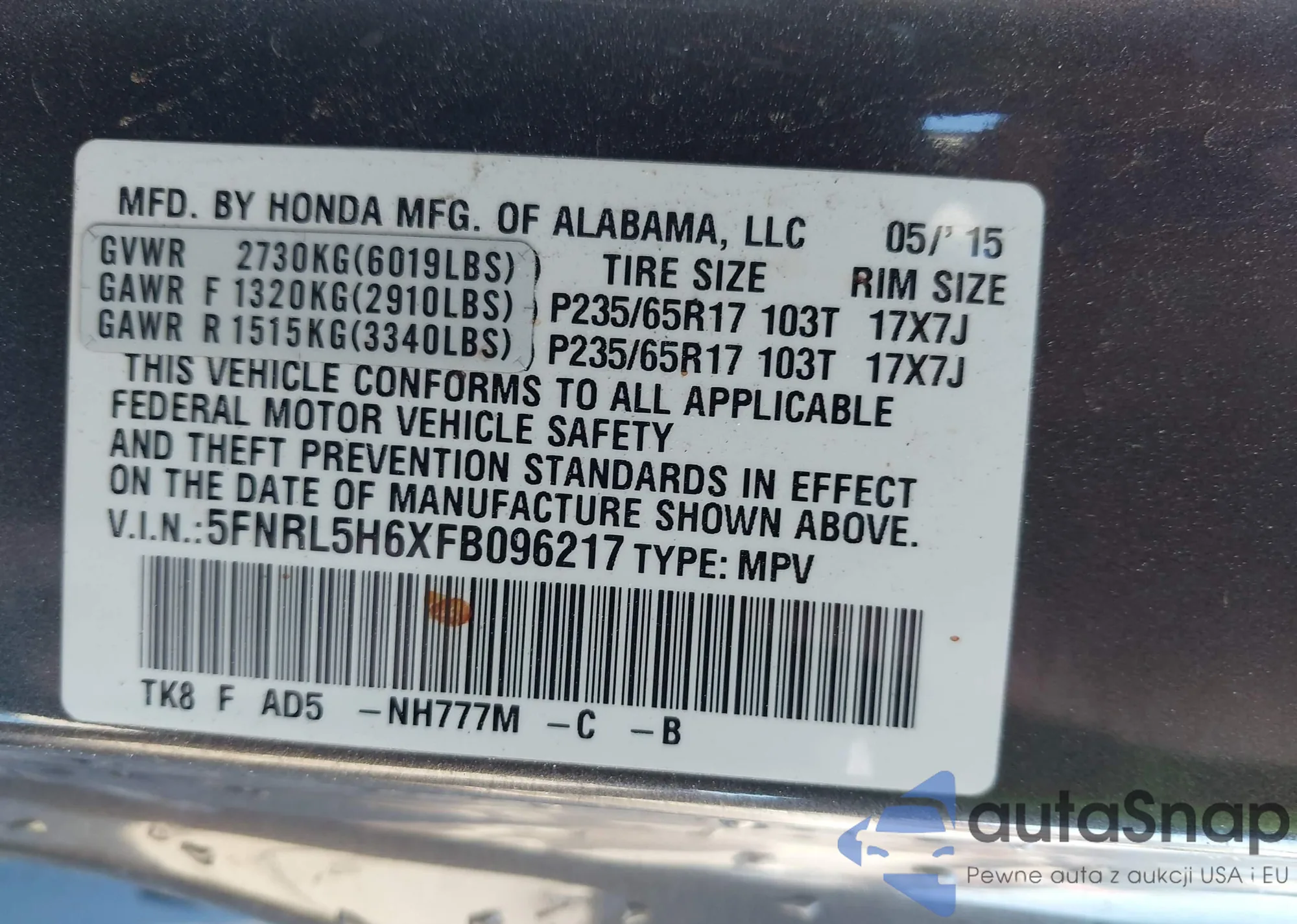 VIN: 5FNRL5H6XFB096217