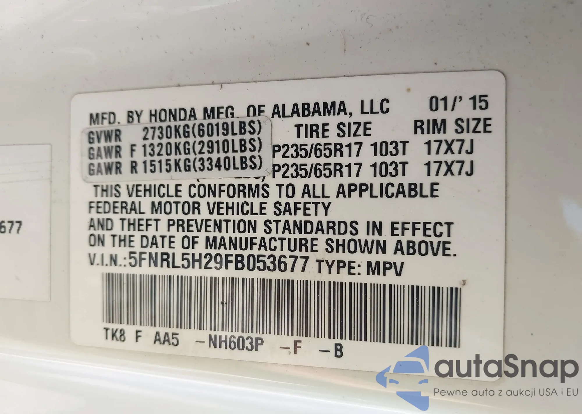 • VIN: 5FNRL5H29FB053677