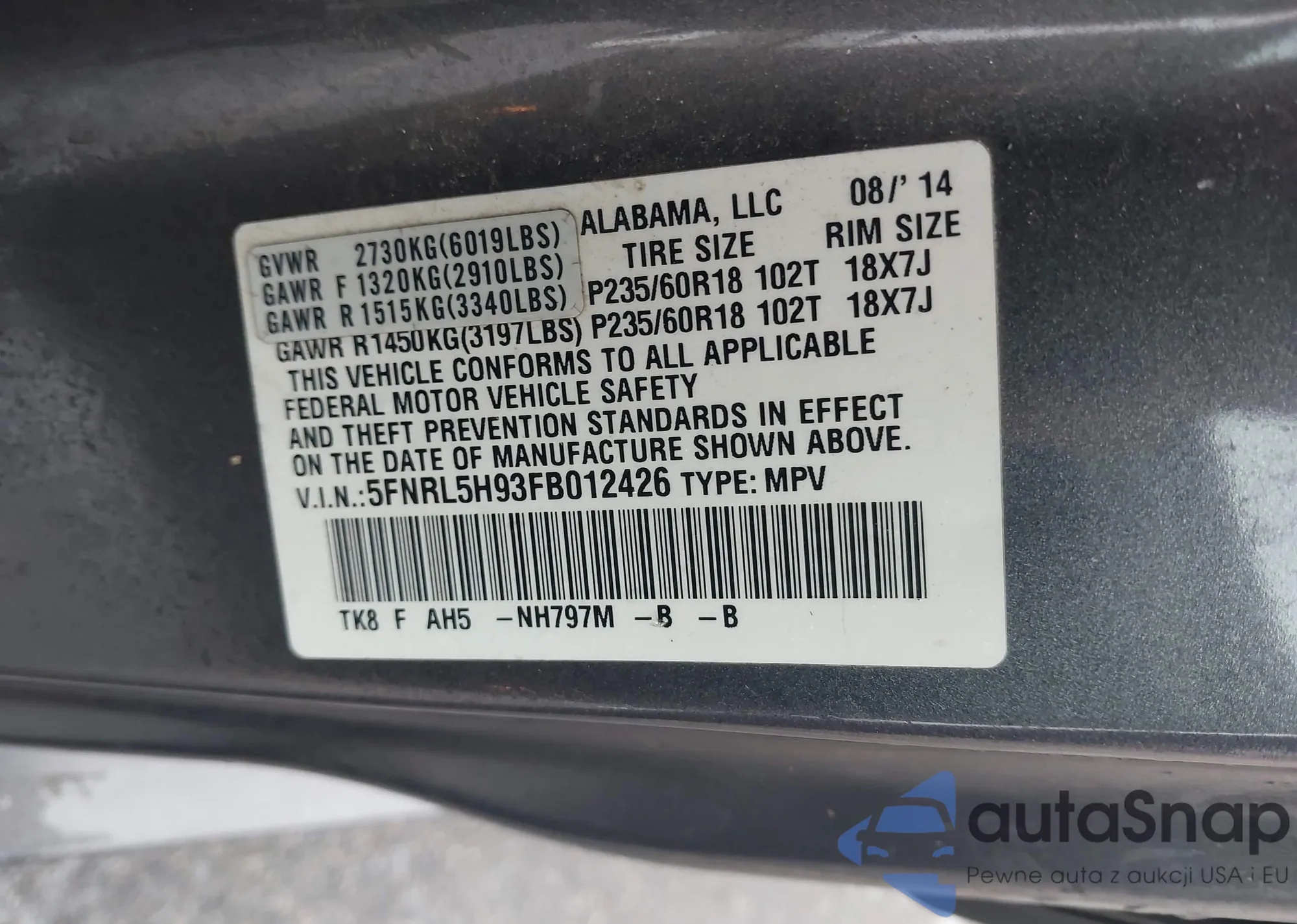 VIN: 5FNRL5H93FB012426