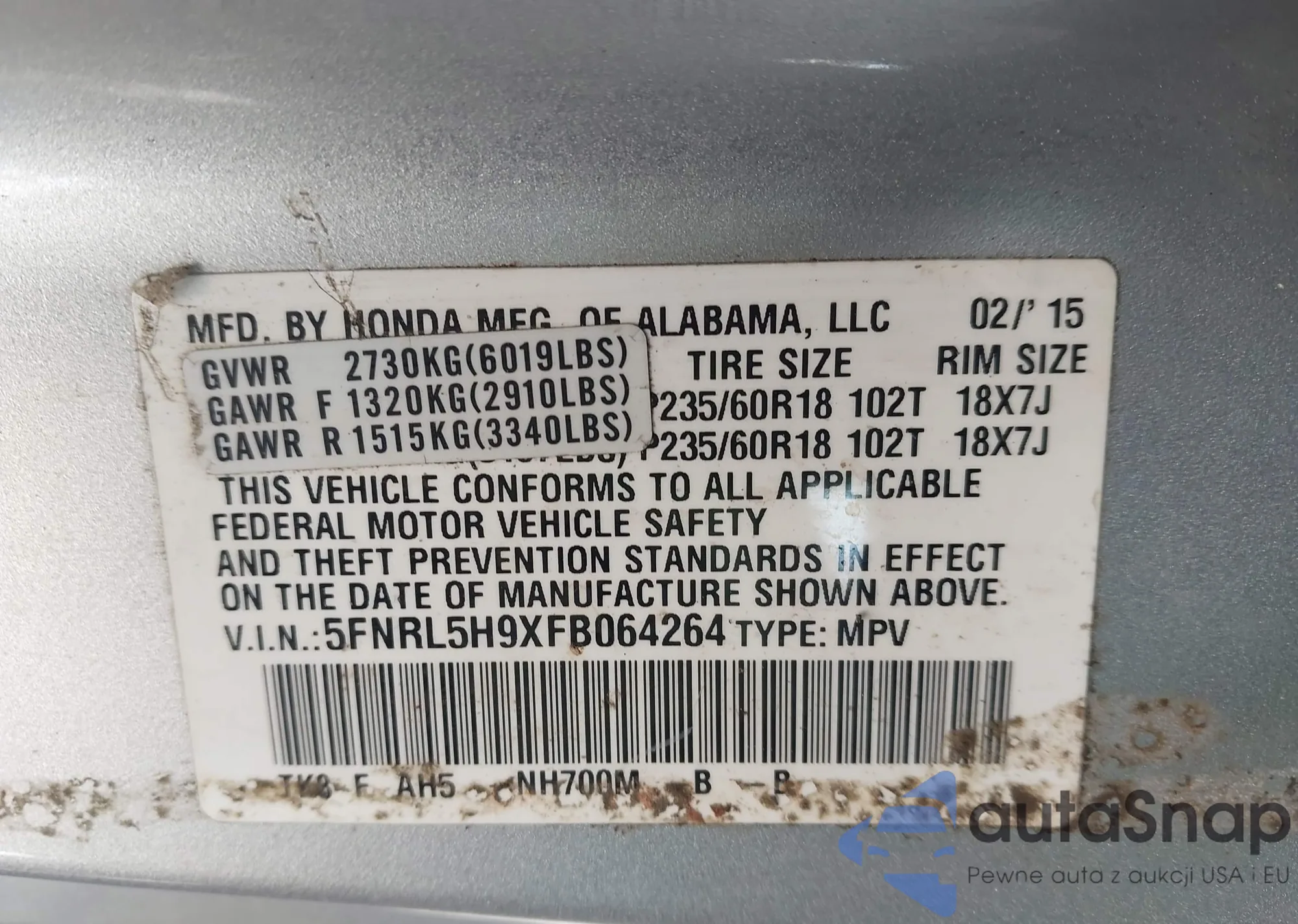 The car Honda Odyssey 2015 (VIN 5FNRL5H9XFB064264) has not been auctioned before. The documents are clean, and the mileage matches or is below the market average. Sold by an insurance company – we recommend purchase. Delivery to the port will take approx. 6–8 weeks.