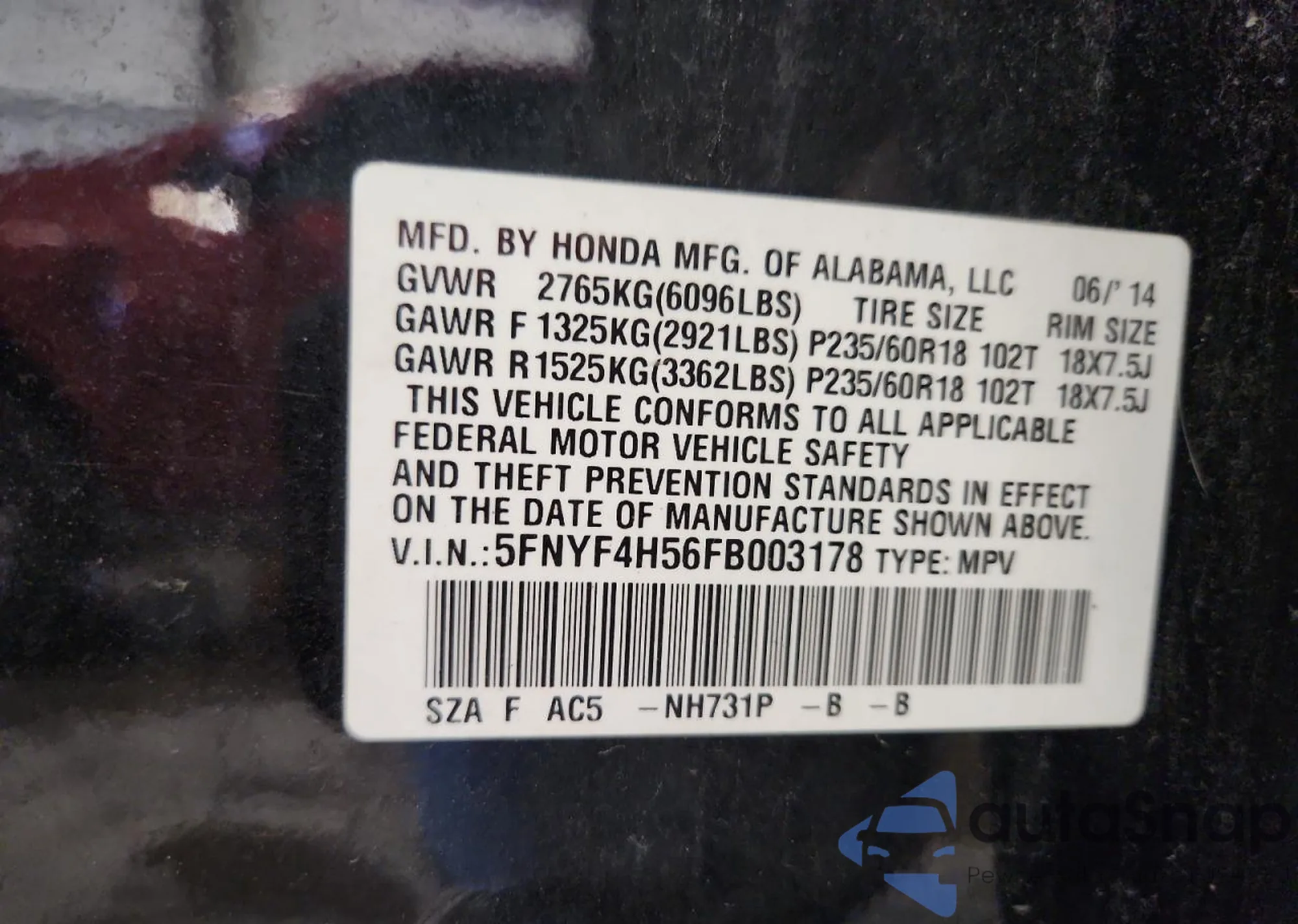 VIN: 5FNYF4H56FB003178