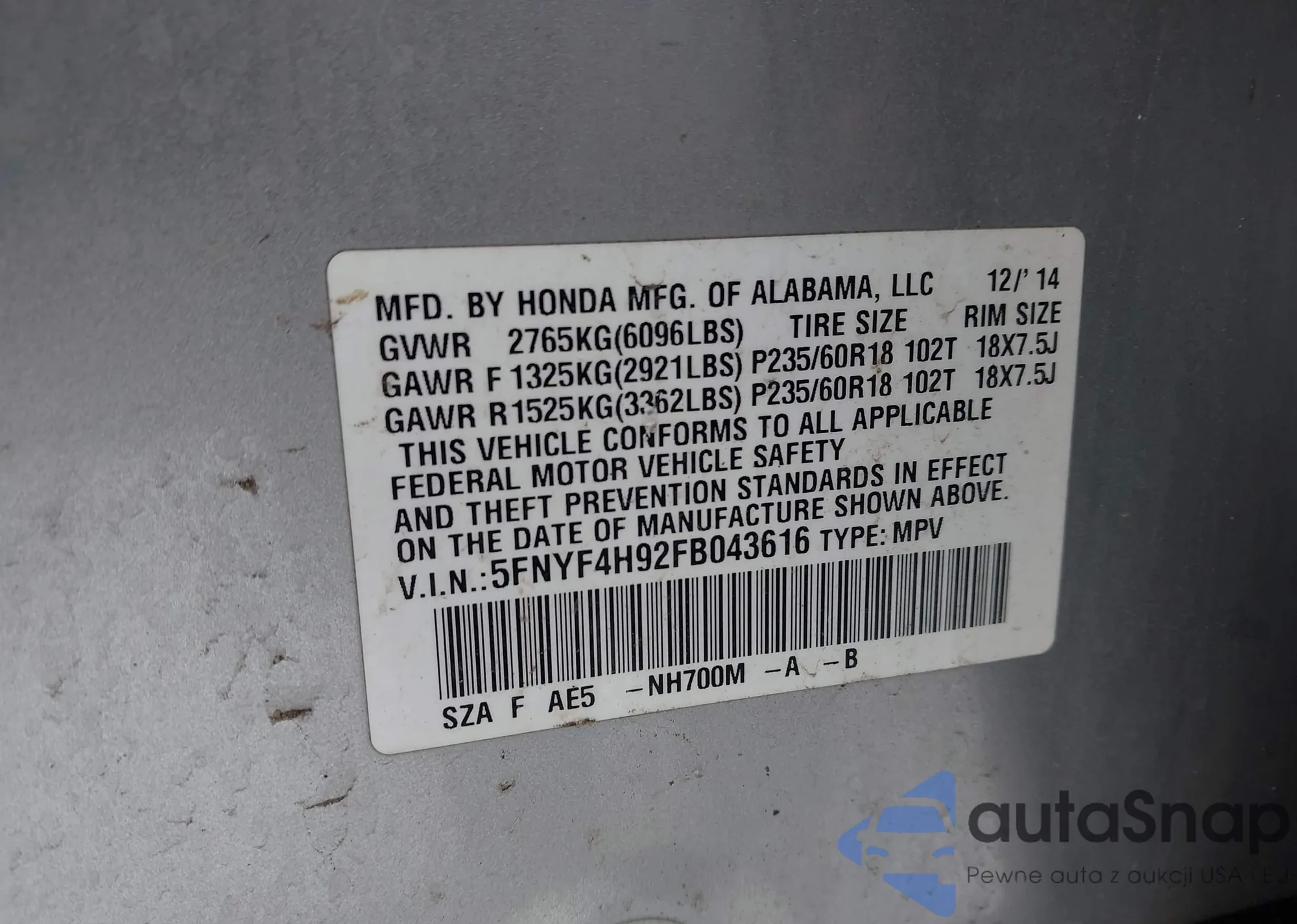 The car Honda Pilot 2015 (VIN 5FNYF4H92FB043616) has not been auctioned before. The documents are clean, and the mileage matches or is below the market average. Sold by an insurance company – we recommend purchase. Delivery to the port will take approx. 6–8 weeks.