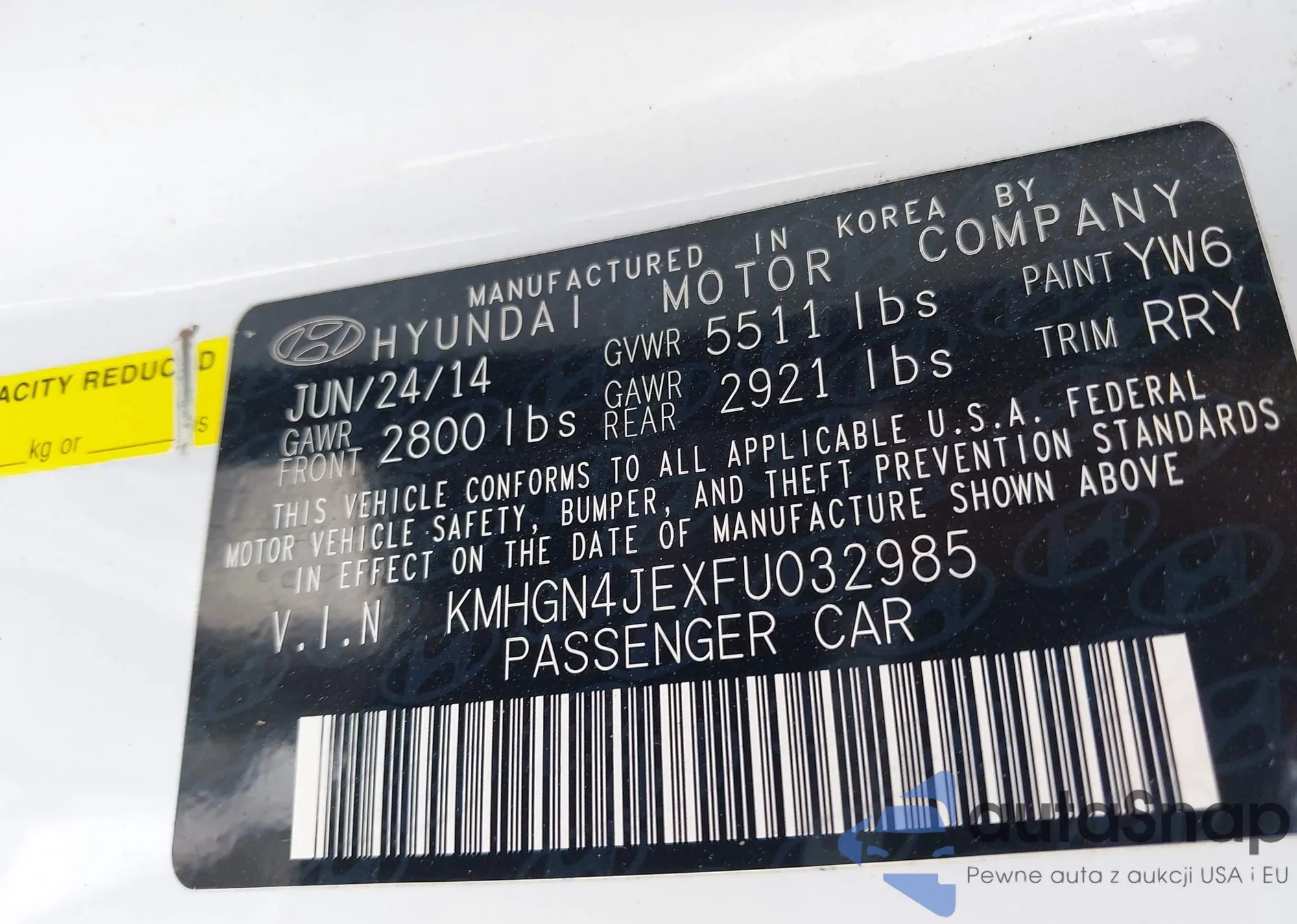 The car Hyundai Genesis 2015 (VIN KMHGN4JEXFU032985) has documents that prevent registration. Export and registration may be difficult. Contact AutaSnap experts to find alternatives.
