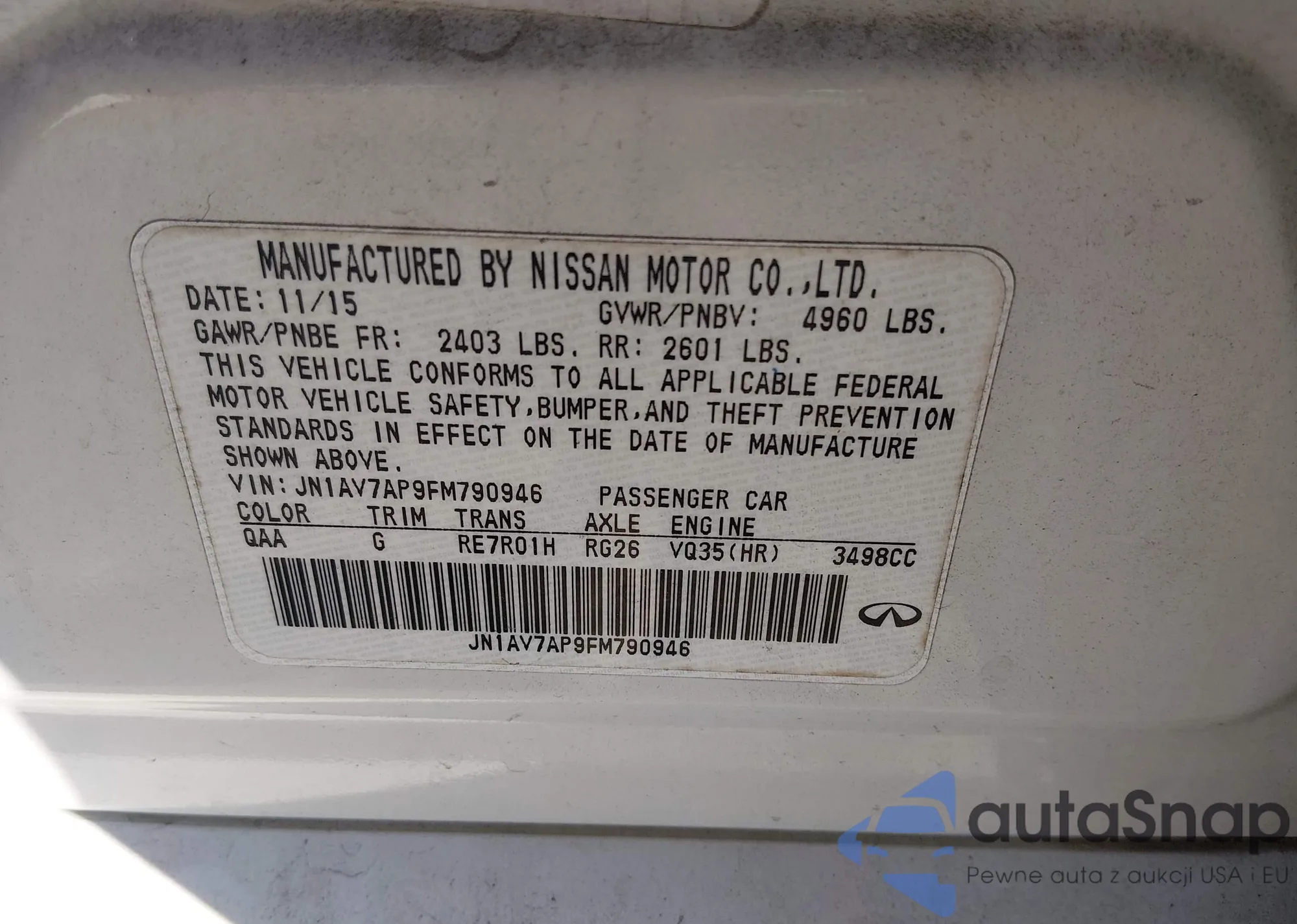 The car Infiniti Q50 2015 (VIN JN1AV7AP9FM790946) is sold by an unverified seller. We recommend checking the Carfax report and confirming registration possibilities before purchase.