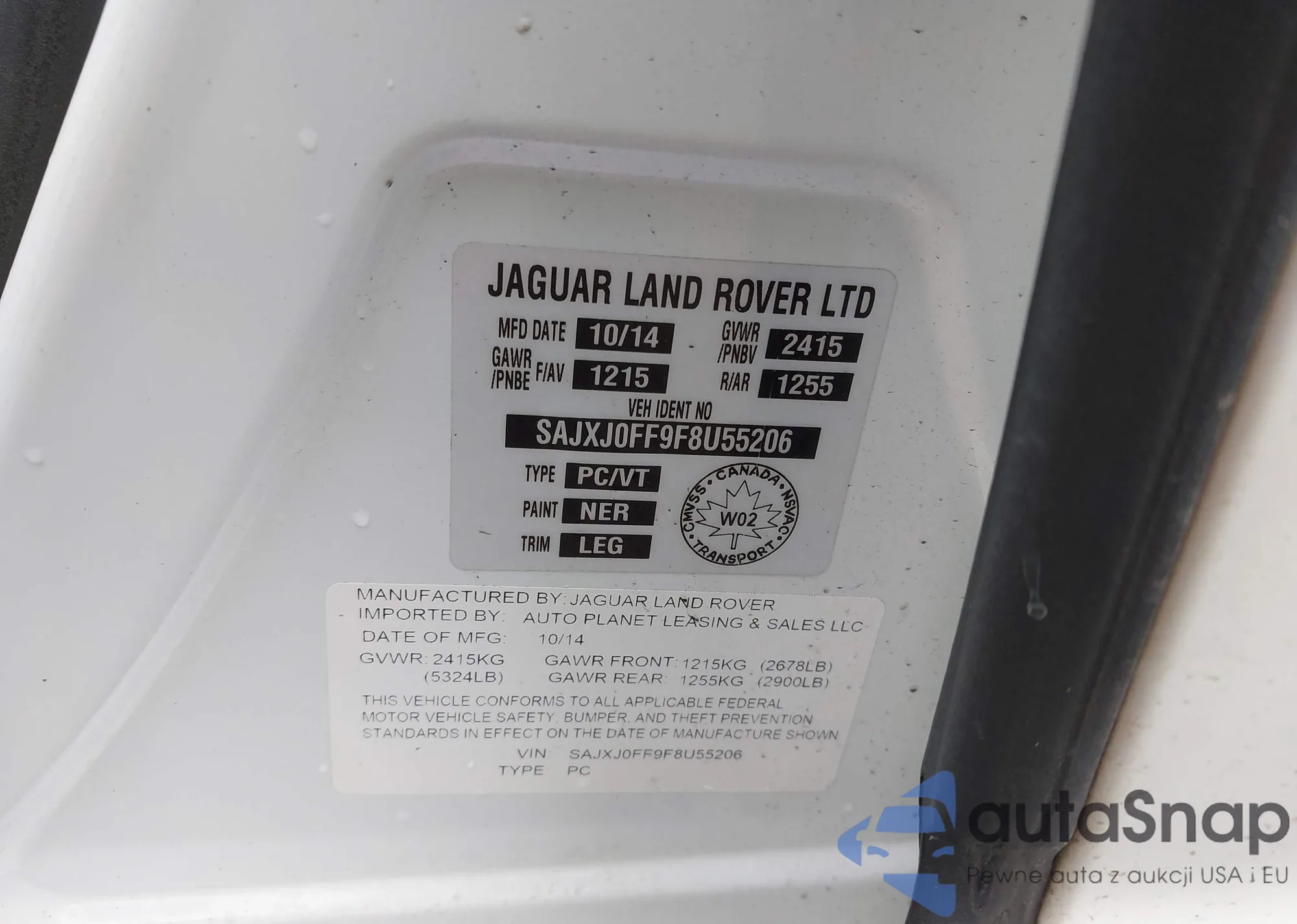 The car Jaguar XF 2015 (VIN SAJXJ0FF9F8U55206) has not been auctioned before. The documents are clean, and the mileage matches or is below the market average. Sold by an insurance company – we recommend purchase. Delivery to the port will take approx. 6–8 weeks.