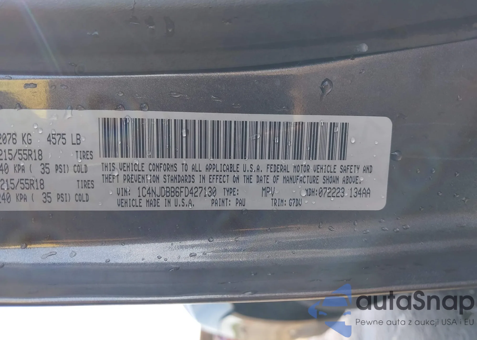 The car Jeep Compass 2015 (VIN 1C4NJDBB6FD427130) has not been auctioned before. The documents are clean, and the mileage matches or is below the market average. Sold by an insurance company – we recommend purchase. Delivery to the port will take approx. 6–8 weeks.