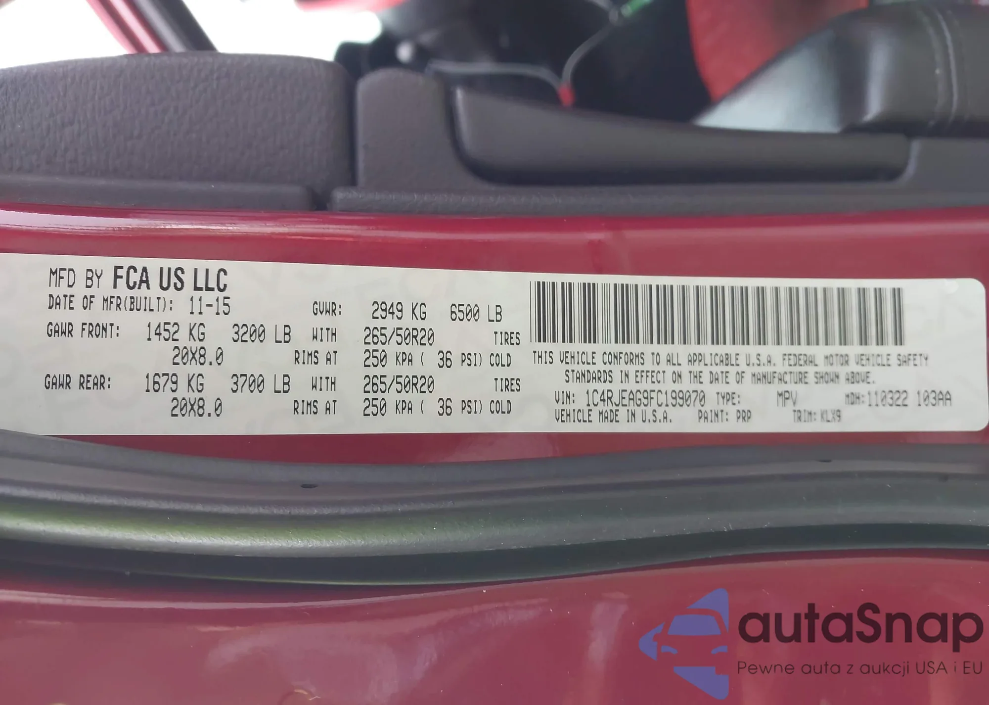 The car Jeep Grand Cherokee 2015 (VIN 1C4RJEAG9FC199070) has not been auctioned before. The documents are clean, and the mileage matches or is below the market average. Sold by an insurance company – we recommend purchase. Delivery to the port will take approx. 6–8 weeks.
