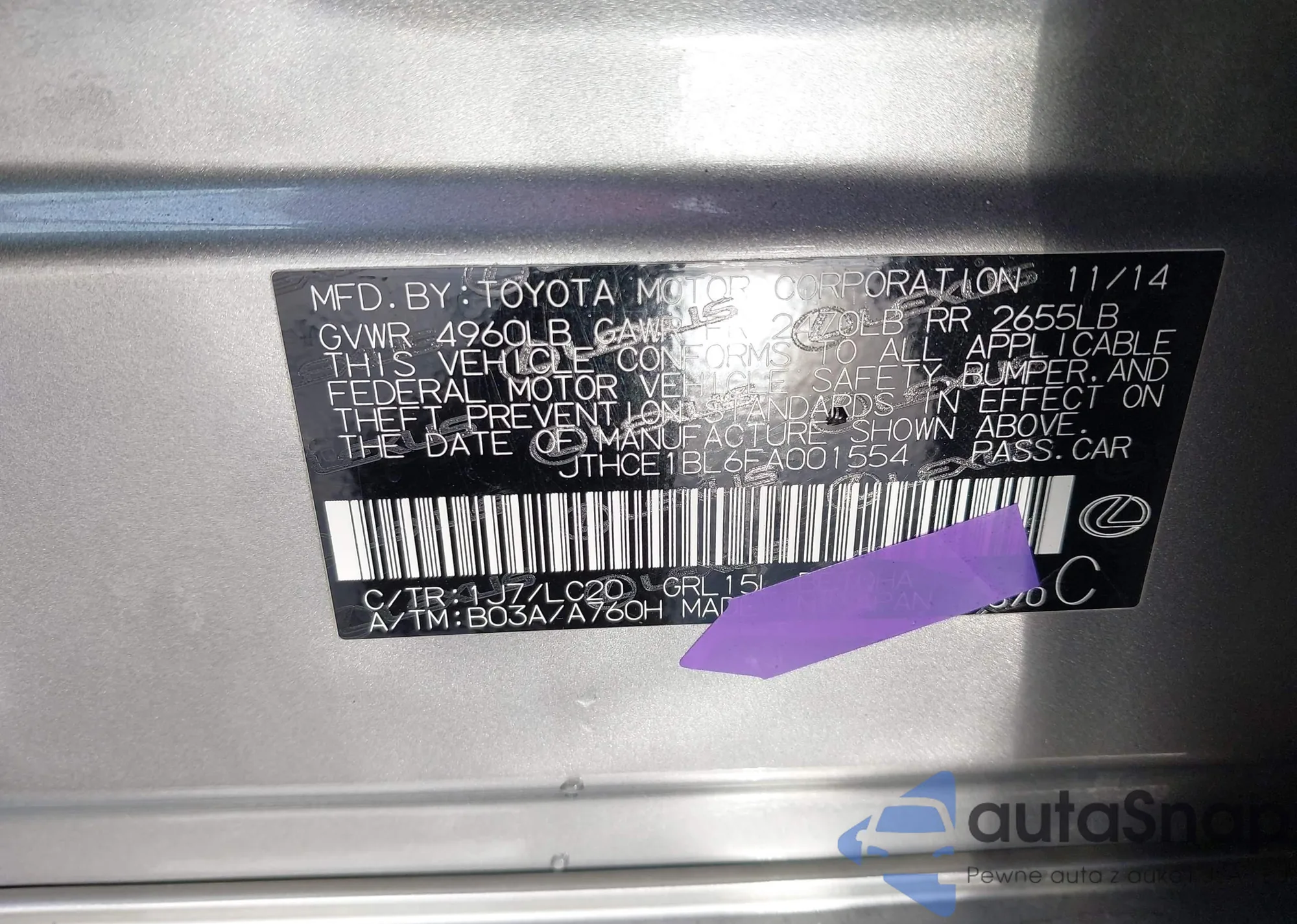 • VIN: JTHCE1BL6FA001554