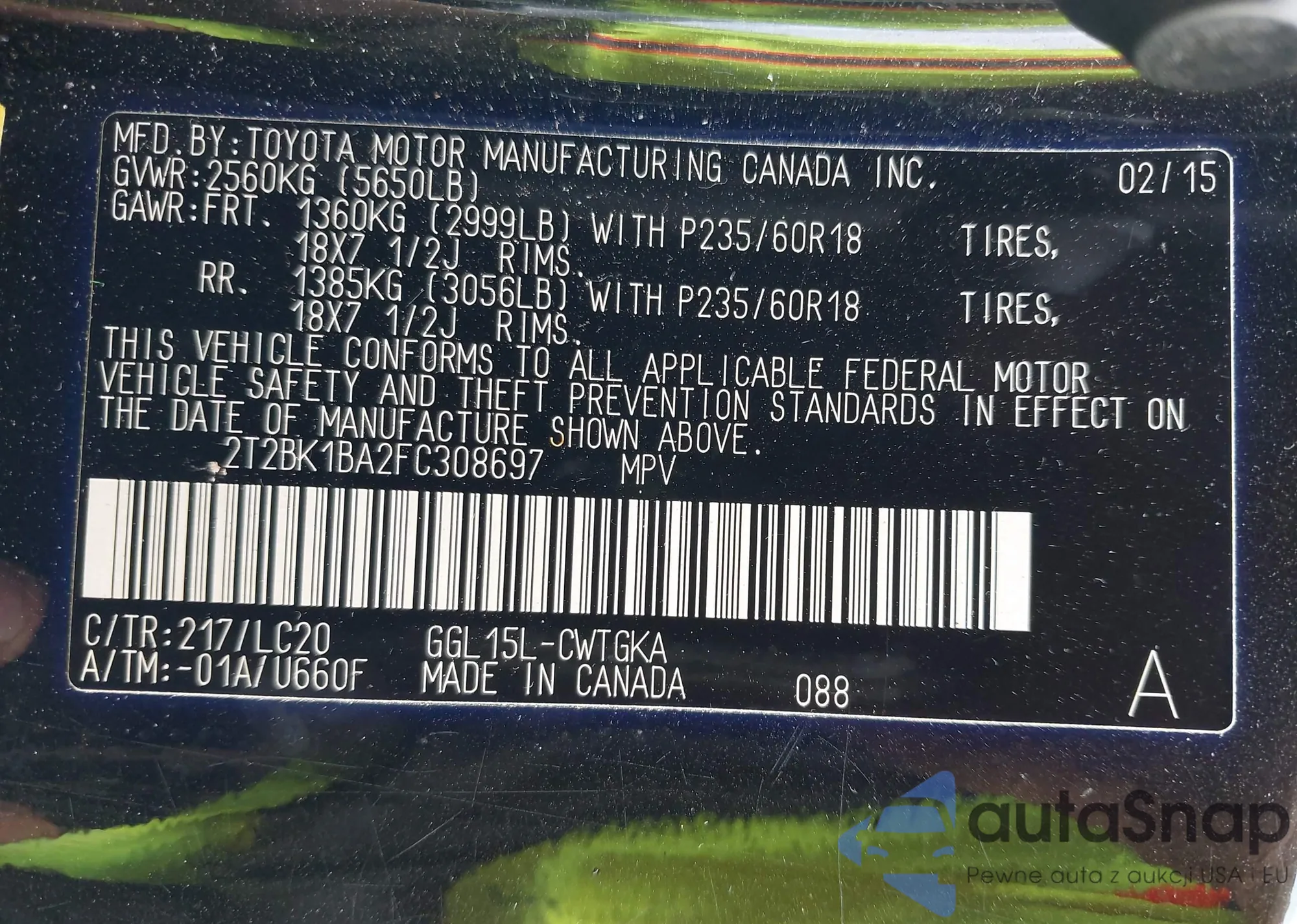 • VIN: 2T2BK1BA2FC308697
