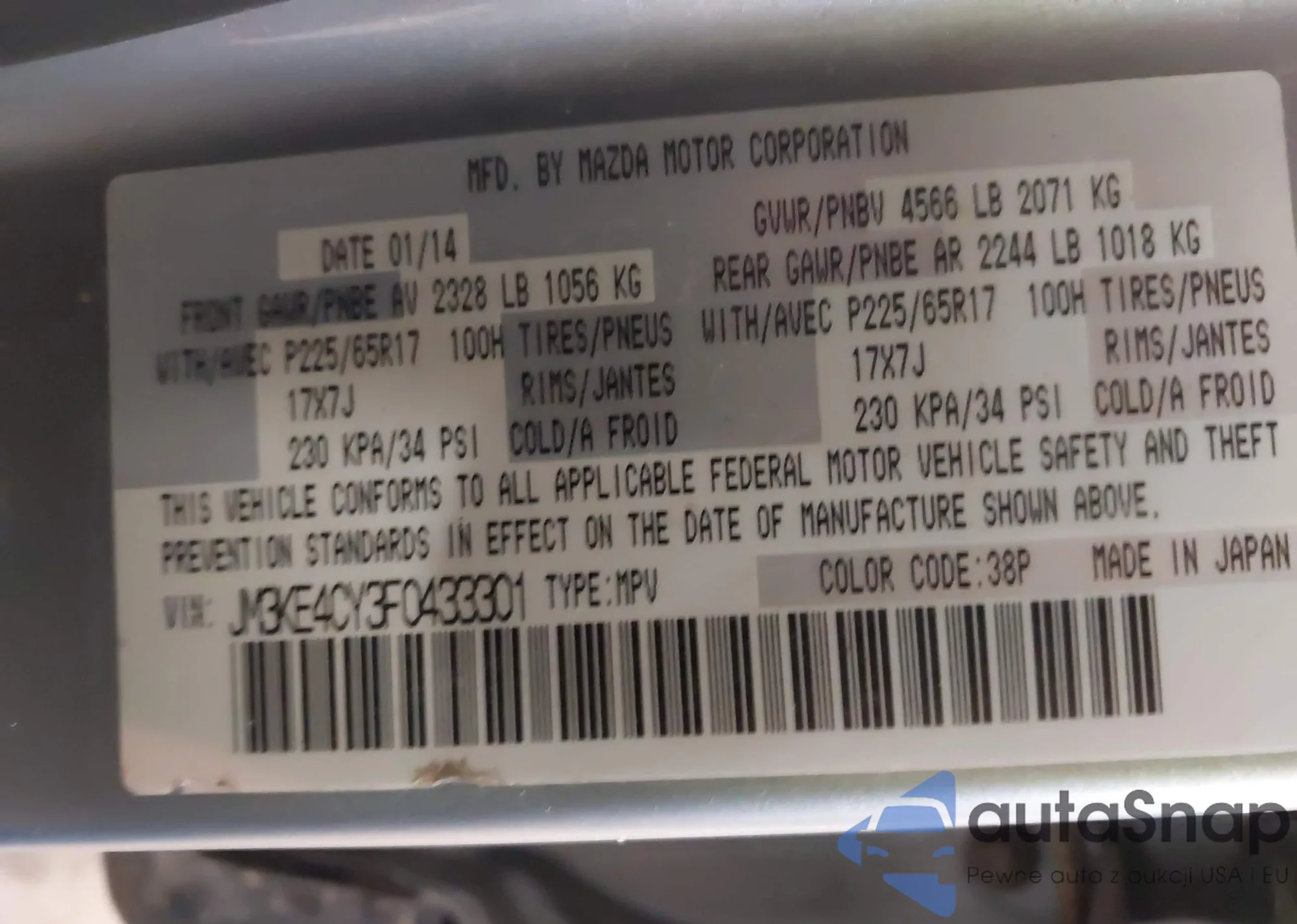 The car Mazda CX-5 2015 (VIN JM3KE4CY3F0433301) has not been auctioned before. The documents are clean, and the mileage matches or is below the market average. Sold by an insurance company – we recommend purchase. Delivery to the port will take approx. 6–8 weeks.