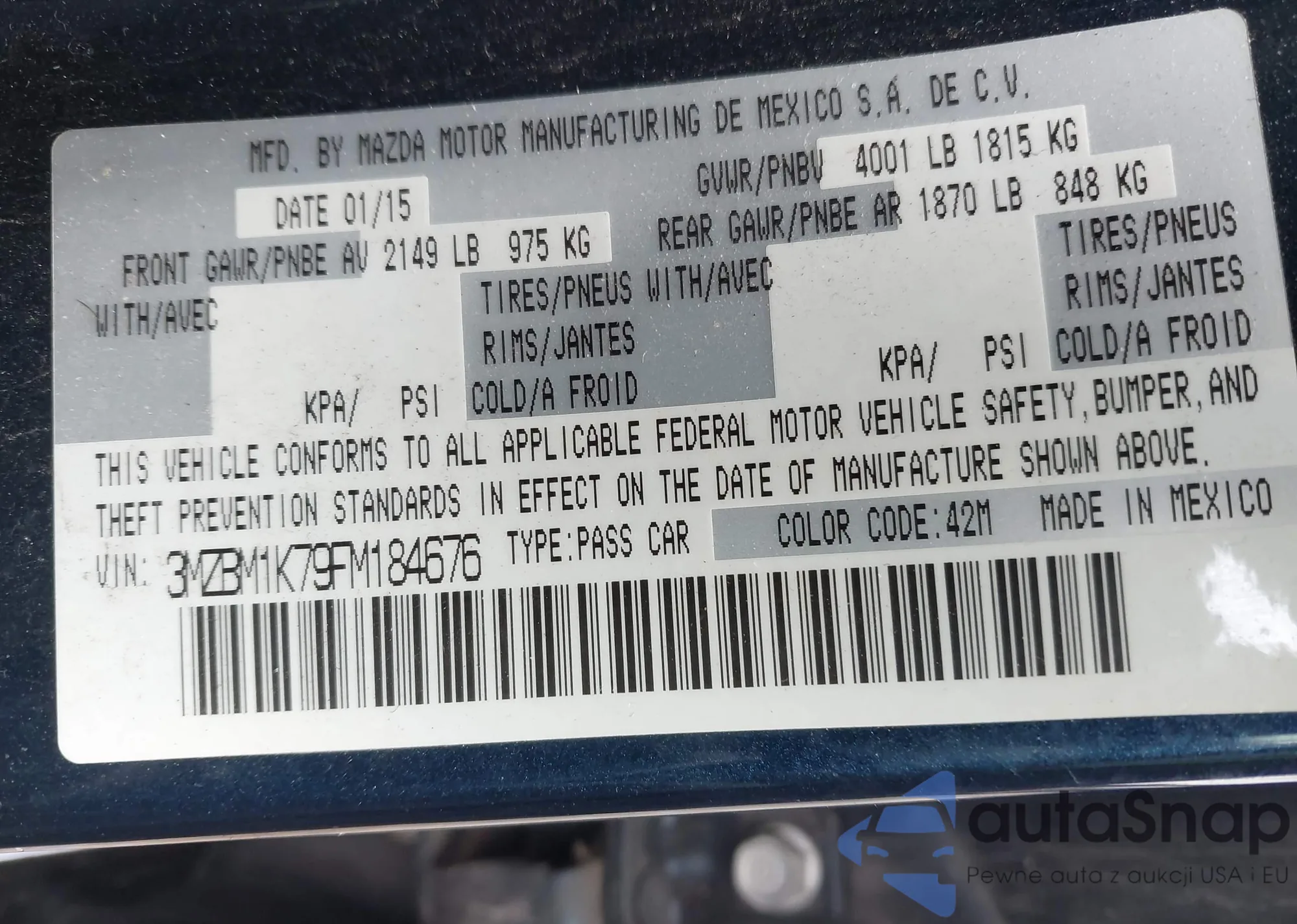 The car Mazda 3 2015 (VIN 3MZBM1K79FM184676) has not been auctioned before. The documents are clean, and the mileage matches or is below the market average. Sold by an insurance company – we recommend purchase. Delivery to the port will take approx. 6–8 weeks.
