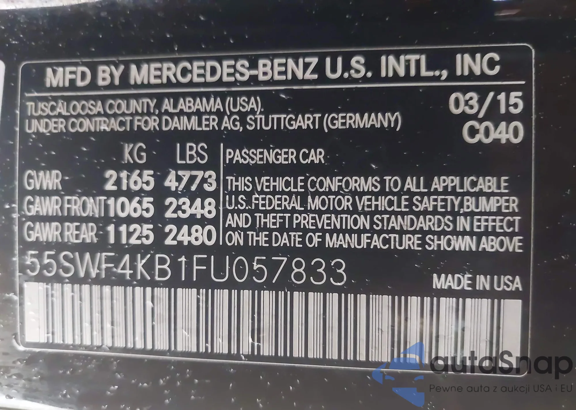 The car Mercedes-Benz C-klasse 2015 (VIN 55SWF4KB1FU057833) has not been auctioned before. The documents are clean, and the mileage matches or is below the market average. Sold by an insurance company – we recommend purchase. Delivery to the port will take approx. 6–8 weeks.
