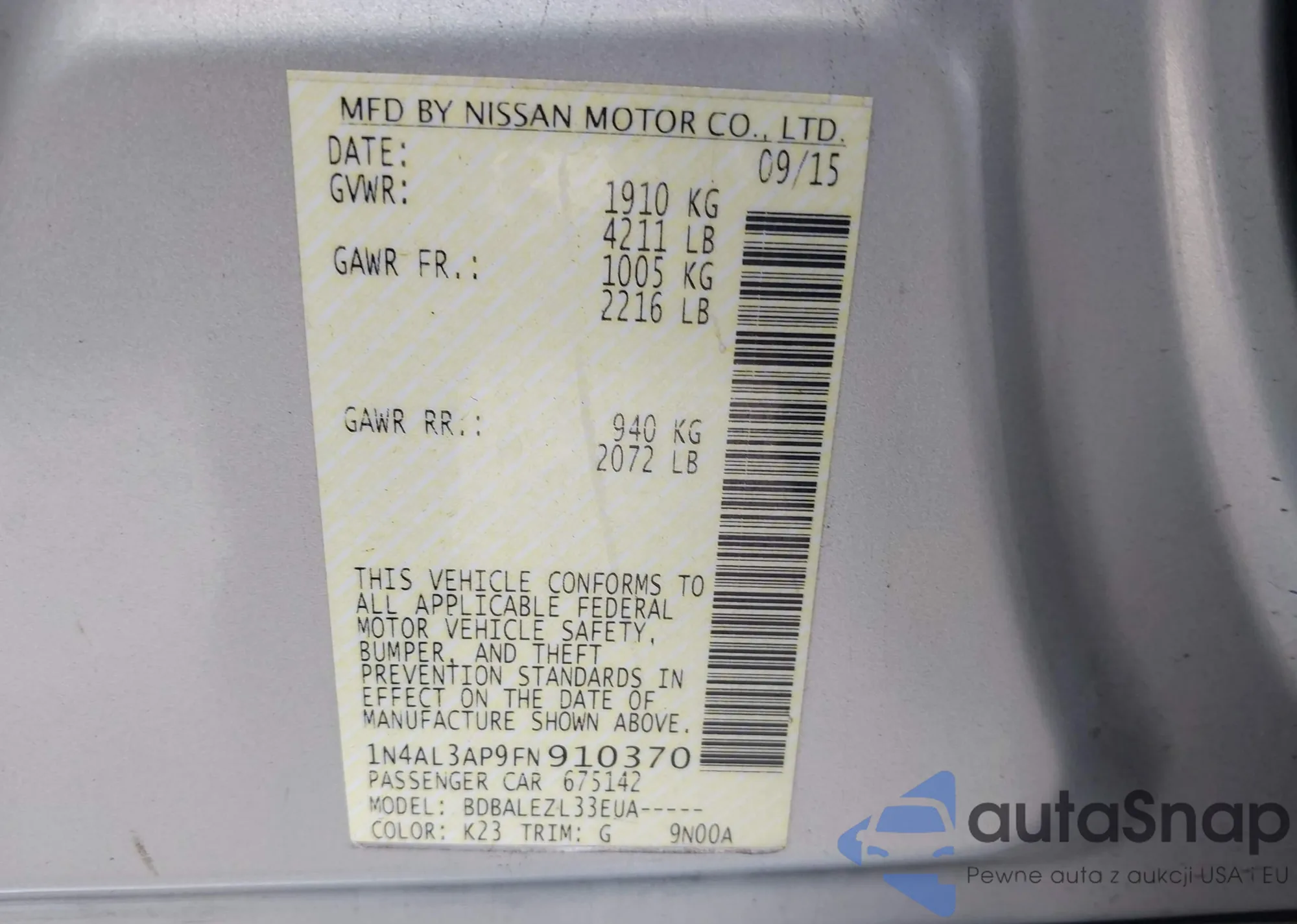 The car Nissan Altima 2015 (VIN 1N4AL3AP9FN910370) has not been auctioned before. The documents are clean, and the mileage matches or is below the market average. Sold by an insurance company – we recommend purchase. Delivery to the port will take approx. 6–8 weeks.