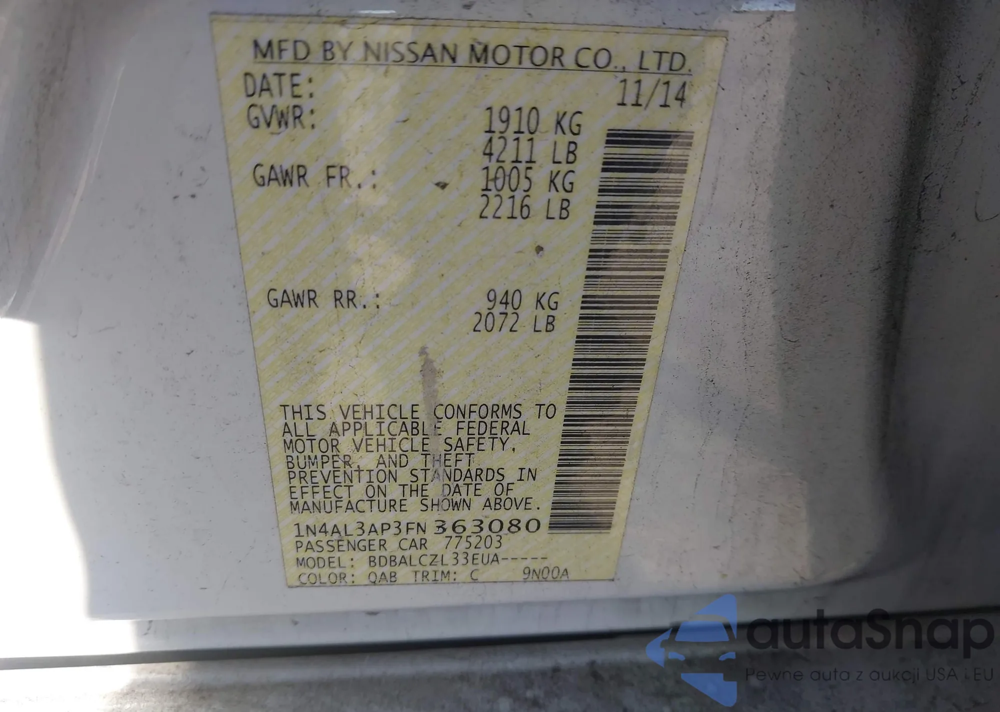 The car Nissan Altima 2015 (VIN 1N4AL3AP3FN363080) has not been auctioned before. The documents are clean, and the mileage matches or is below the market average. Sold by an insurance company – we recommend purchase. Delivery to the port will take approx. 6–8 weeks.