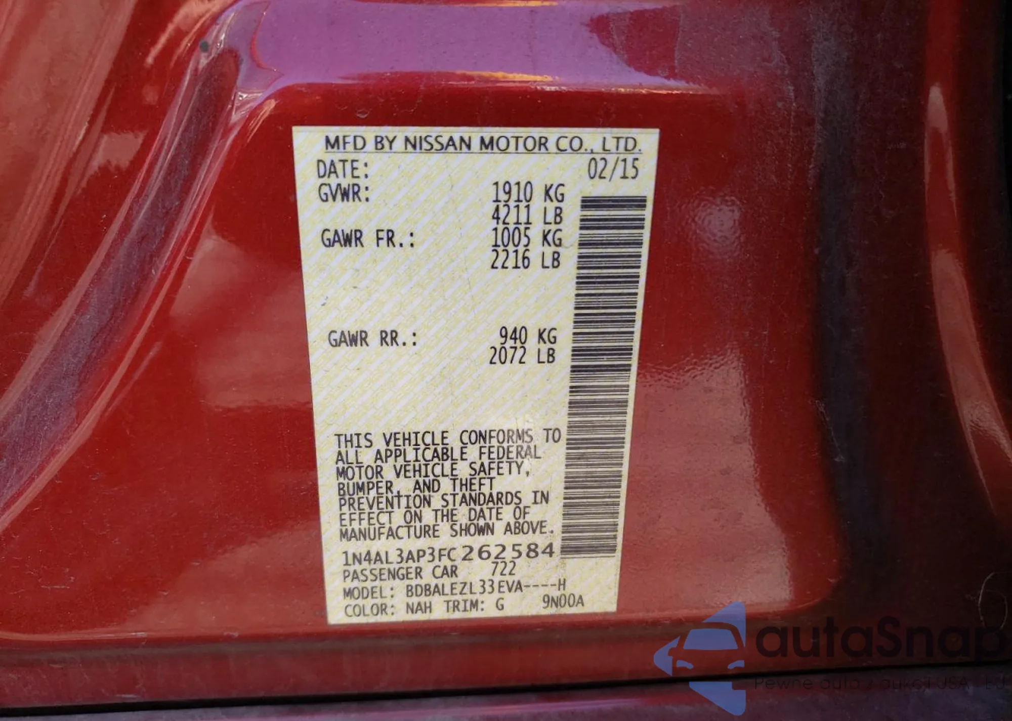 • VIN: 1N4AL3AP3FC262584
