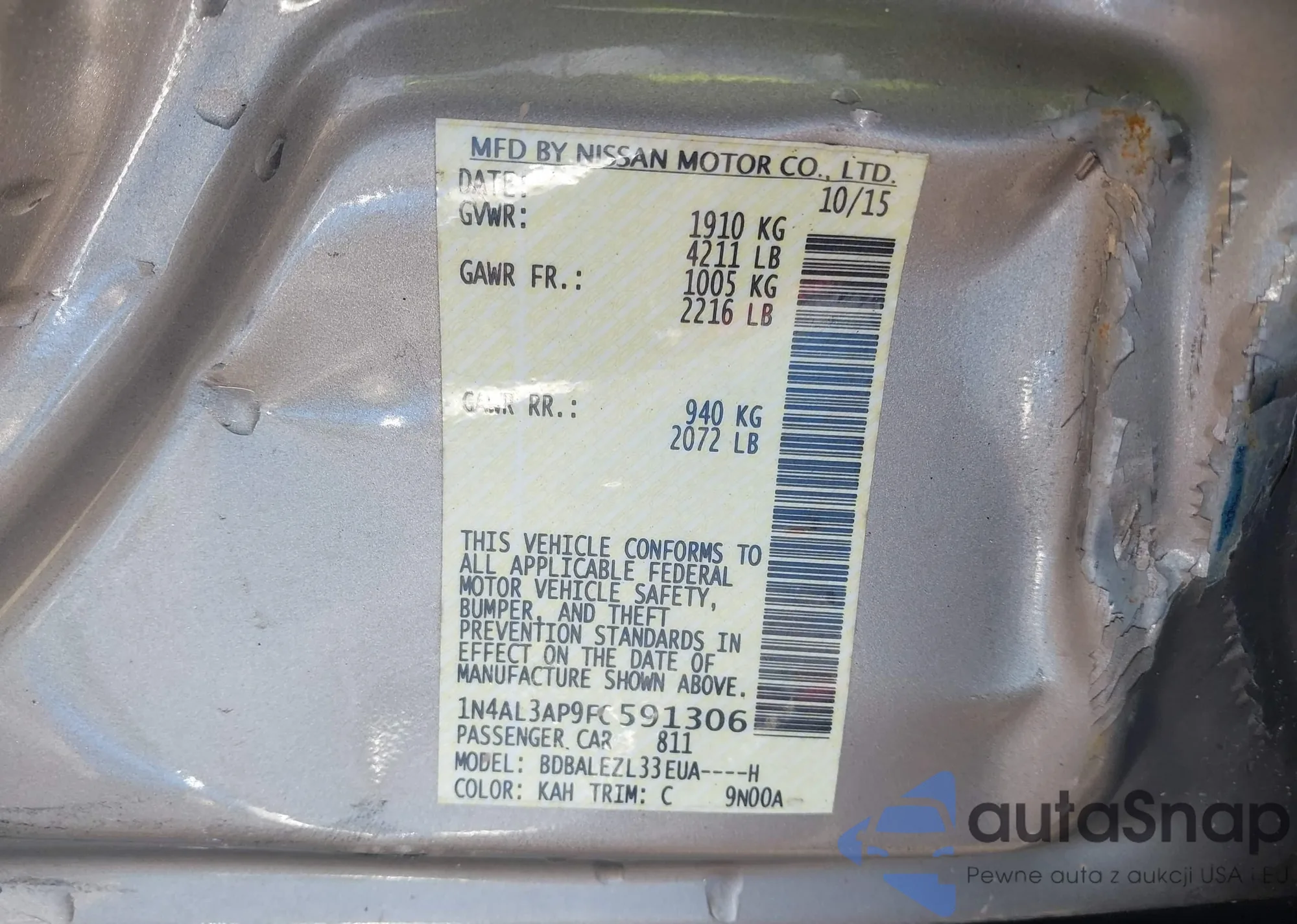 The car Nissan Altima 2015 (VIN 1N4AL3AP9FC591306) has not been auctioned before. The documents are clean, and the mileage matches or is below the market average. Sold by an insurance company – we recommend purchase. Delivery to the port will take approx. 6–8 weeks.