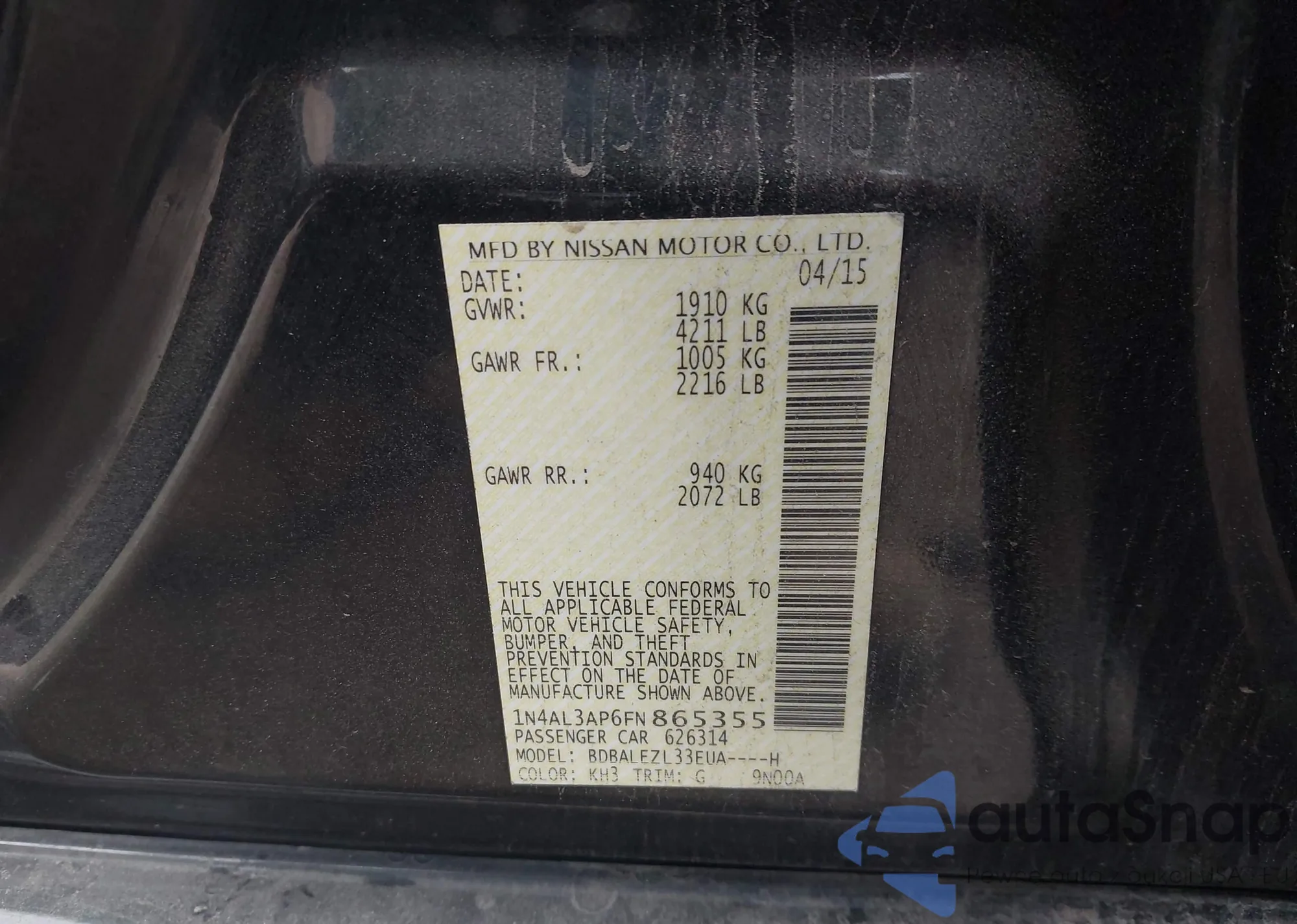 The car Nissan Altima 2015 (VIN 1N4AL3AP6FN865355) is sold by an unverified seller. We recommend checking the Carfax report and confirming registration possibilities before purchase.