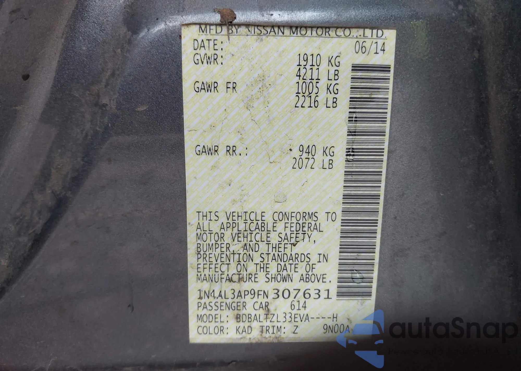 The car Nissan Altima 2015 (VIN 1N4AL3AP9FN307631) has not been auctioned before. The documents are clean, and the mileage matches or is below the market average. Sold by an insurance company – we recommend purchase. Delivery to the port will take approx. 6–8 weeks.