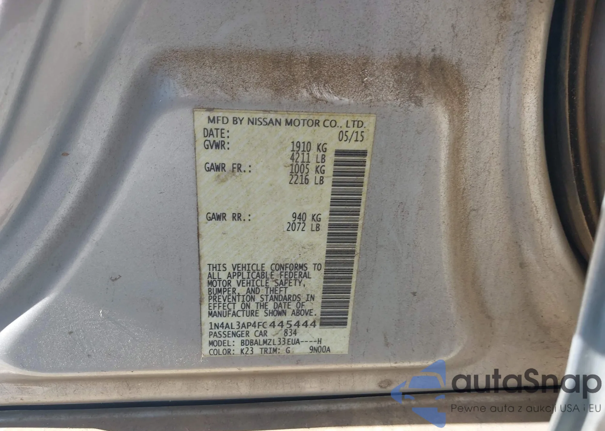 The car Nissan Altima 2015 (VIN 1N4AL3AP4FC445444) has not been auctioned before. The documents are clean, and the mileage matches or is below the market average. Sold by an insurance company – we recommend purchase. Delivery to the port will take approx. 6–8 weeks.